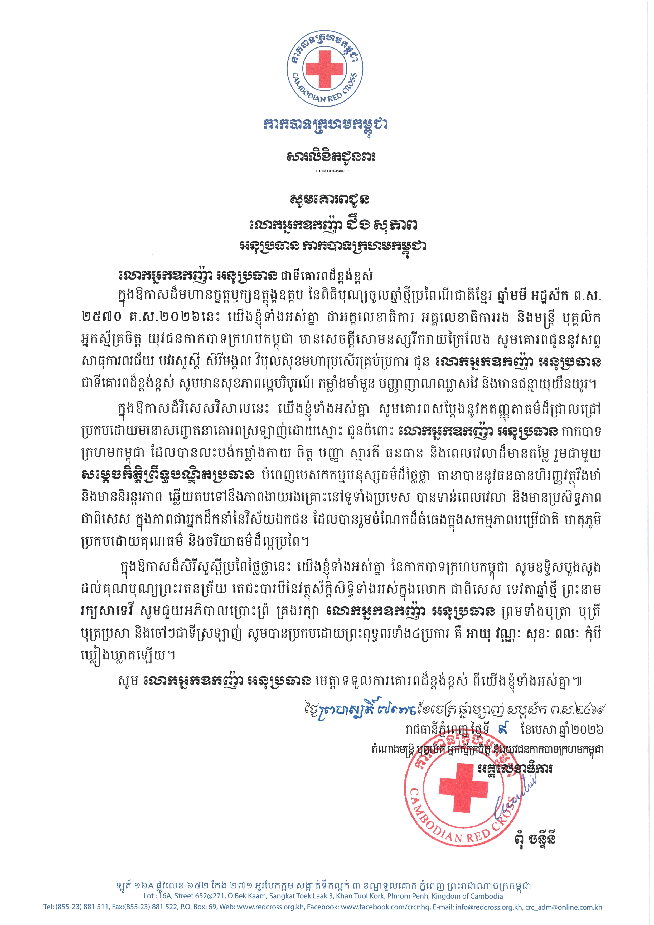 ក្នុងឱកាសដ៏សិរីសួស្តីប្រពៃថ្លៃថ្លានេះ យើងខ្ញុំទាំងអស់គ្នា នៃកាកបាទក្រហមកម្ពុជា សូមឧទ្ទិសបួងសួង ដល់គុណបុណ្យព្រះរតនត្រ័យ តេជះបារមីនៃវត្ថុស័ក្តិសិទ្ធិទាំងអស់ក្នុងលោក ជាពិសេស ទេវតាឆ្នាំថ្មី ព្រះនាម «រាក្យសាទេវី» សូមជួយអភិបាលប្រោះព្រំ គ្រងរក្សា លោកអ្នកឧកញ៉ា អនុប្រធាន ព្រមទាំងបុត្រា បុត្រី បុត្រប្រសា និងចៅៗជាទីស្រឡាញ់ សូមបានប្រកបដោយព្រះពុទ្ធពរទាំង៤ប្រការ គឺ អាយុ វណ្ណៈ សុខៈ ពលៈ កុំបី ឃ្លៀងឃ្លាតឡើយ៕