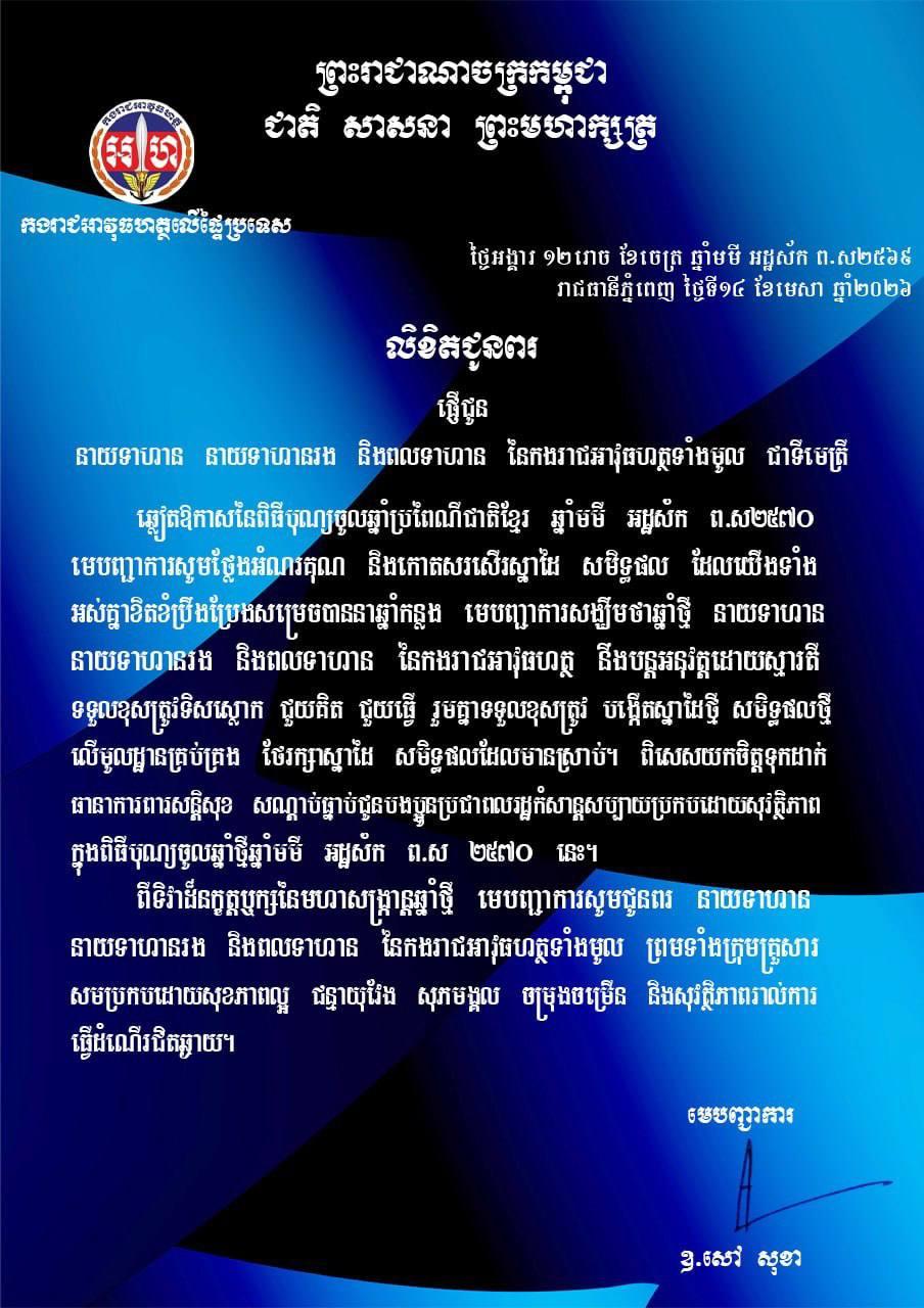 នាយឧត្តមសេនីយ៍ សៅ សុខា ផ្ញើសារជូនពរនាយទាហាន នាយទាហានរង និងពលទាហាននៃកងរាជអាវុធហត្ថទាំងអស់ ក្នុងឱកាសបុណ្យចូលឆ្នាំថ្មី