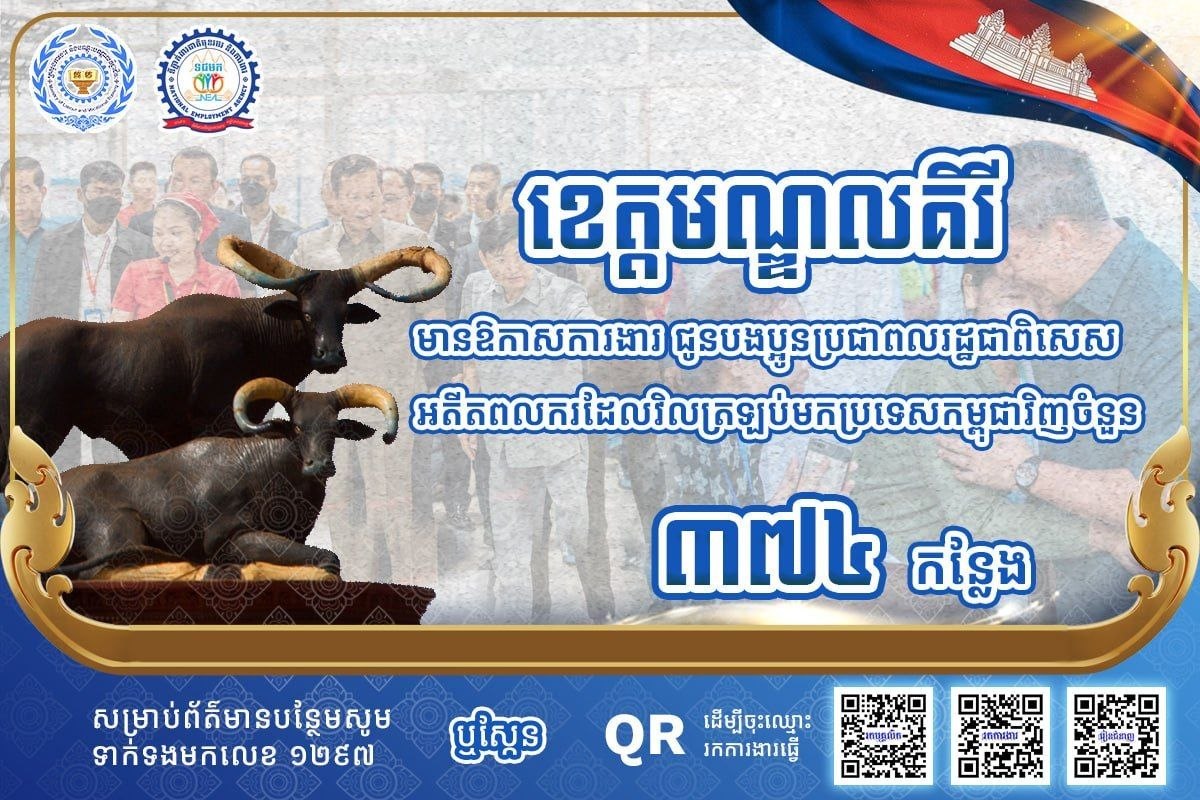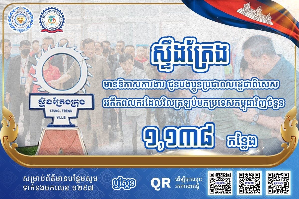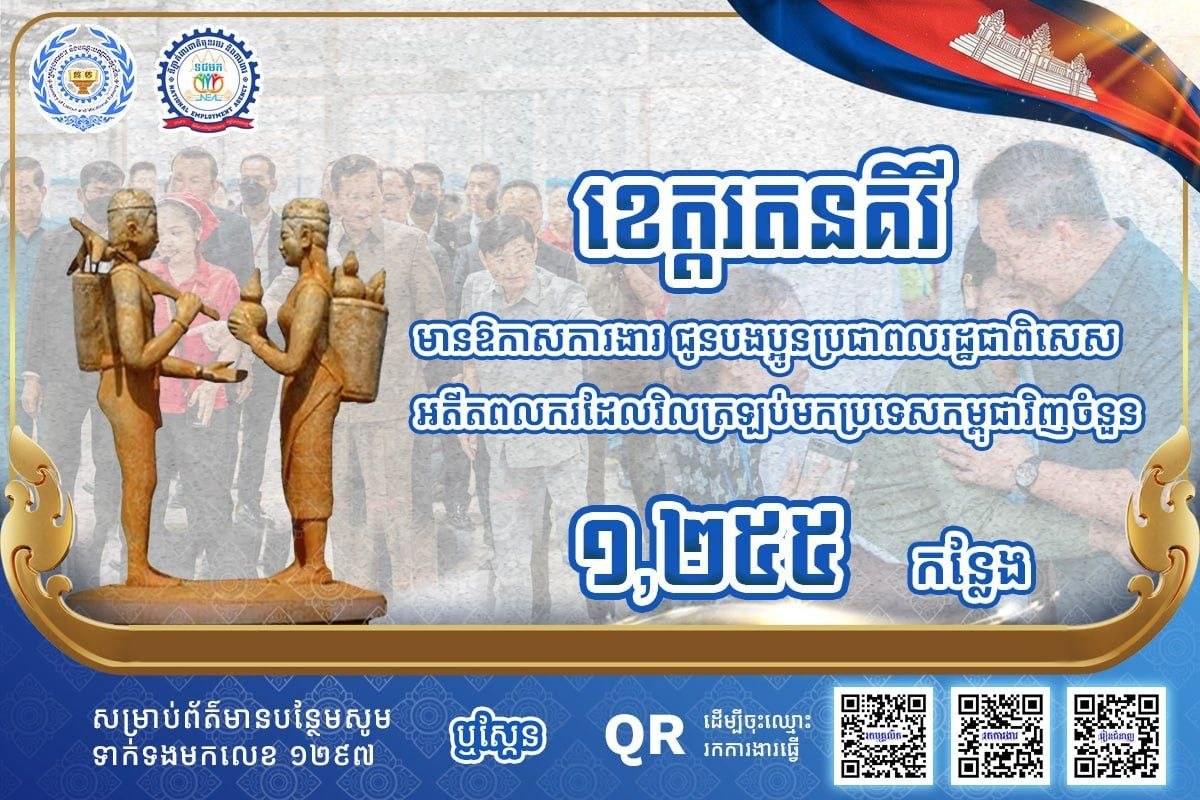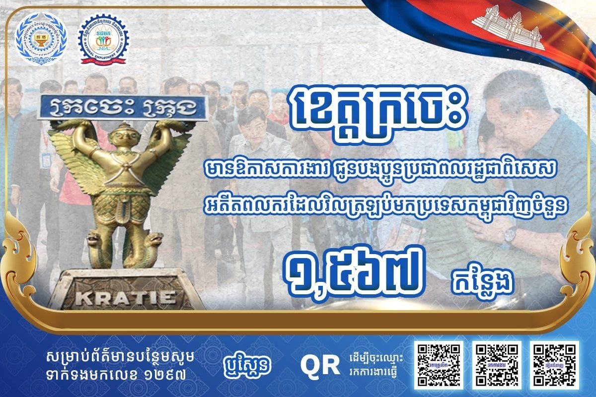 តាមរយៈការផ្សព្វផ្សាយ ក្រសួងការងារ បានឱ្យដឹងថា គិតត្រឹមថ្ងៃទី១៣ ខែមេសា ឆ្នាំ២០២៦នេះ ខេត្តស្ថិតនៅភូមិភាគឦសាន្តរួមមាន៖ ខេត្តក្រចេះ ខេត្តស្ទឹងត្រែង ខេត្តរតនគិរី និងខេត្តមណ្ឌលគិរី មានឱកាសការងារសរុបចំនួន ៤,៣៣៤កន្លែង កំពុងរង់ចាំបងប្អូនអតីតពលករត្រឡប់មកពីប្រទេសថៃ និងអ្នកកំពុងស្វែងរកការងារធ្វើ។ ឱកាសការងារទាំងនោះ ស្ថិតក្នុងវិស័យកសិកម្ម និងវិស័យសេវាកម្ម។
