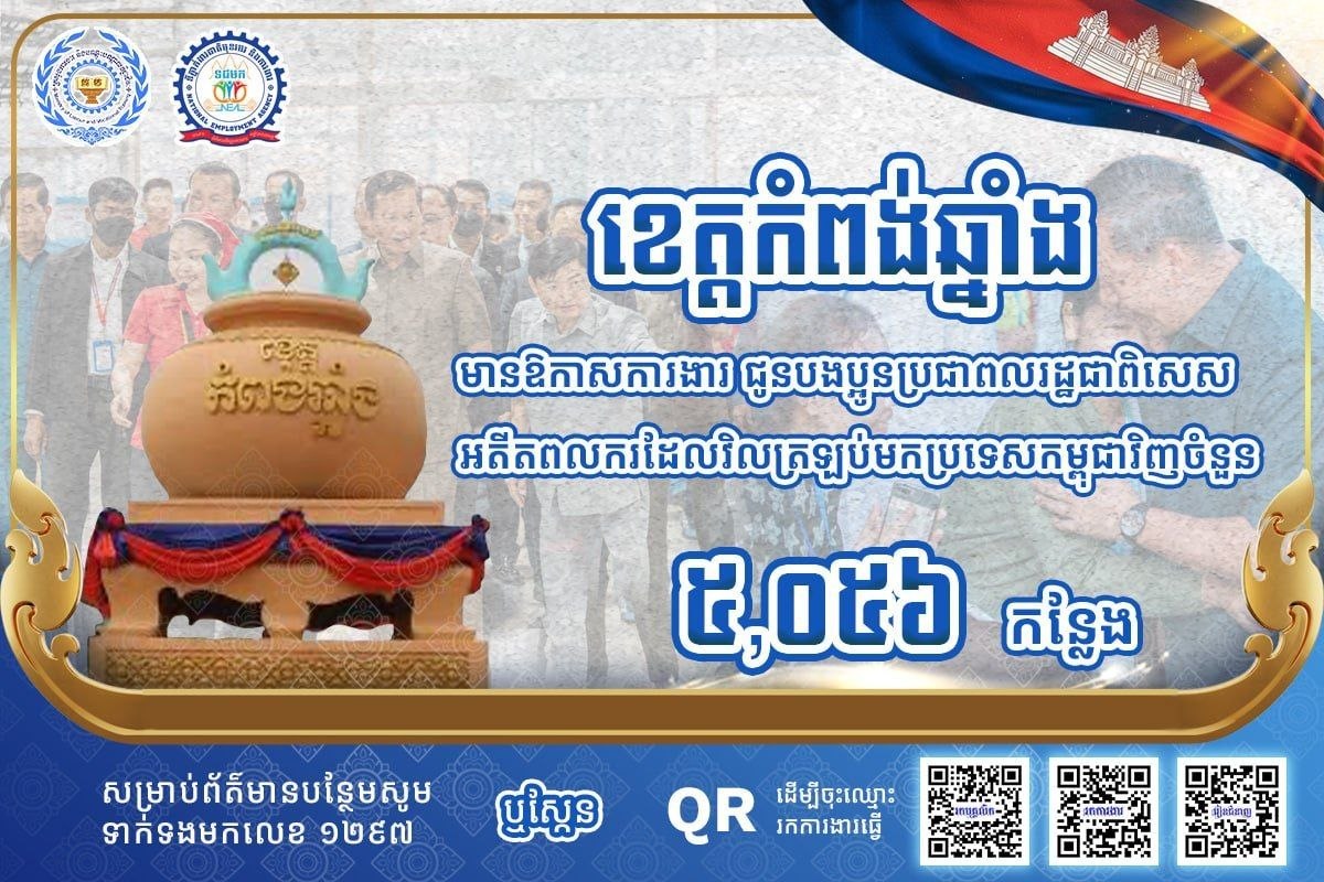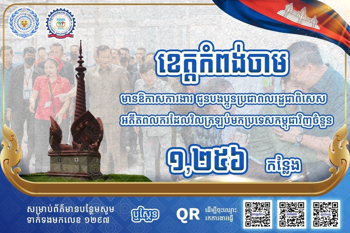 តាមរយៈការផ្សព្វផ្សាយ ក្រសួងការងារបានឱ្យដឹងថា គិតត្រឹមថ្ងៃទី ១៣ ខែមេសា ឆ្នាំ២០២៦នេះ ខេត្តកំពង់ចាម ខេត្តកំពង់ឆ្នាំង និងខេត្តកំពង់ធំមានឱកាសការងារសរុបចំនួន ៦,៨៦១កន្លែង កំពុងរង់ចាំបងប្អូនអតីតពលករត្រឡប់មកពីប្រទេសថៃ និងអ្នកកំពុងស្វែងរកការងារធ្វើនៅក្នុងវិស័យកសិកម្ម ឧស្សាហកម្ម និងវិស័យសេវាកម្ម។