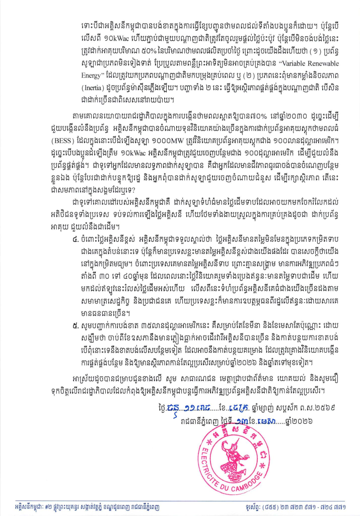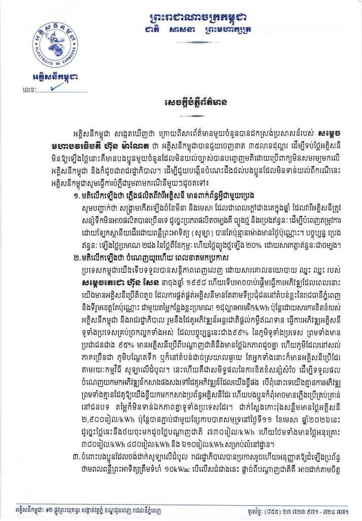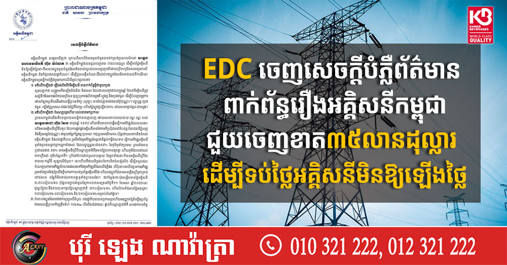 EDC ចេញសេចក្តីបំភ្លឺព័ត៌មាន ពាក់ព័ន្ធរឿងអគ្គិសនីកម្ពុជាជួយចេញខាត៣៥លានដុល្លារ ដើម្បីទប់ថ្លៃអគ្គិសនីមិនឱ្យឡើងថ្លៃ