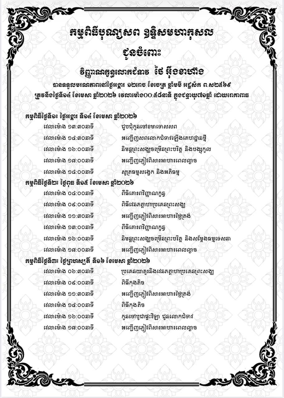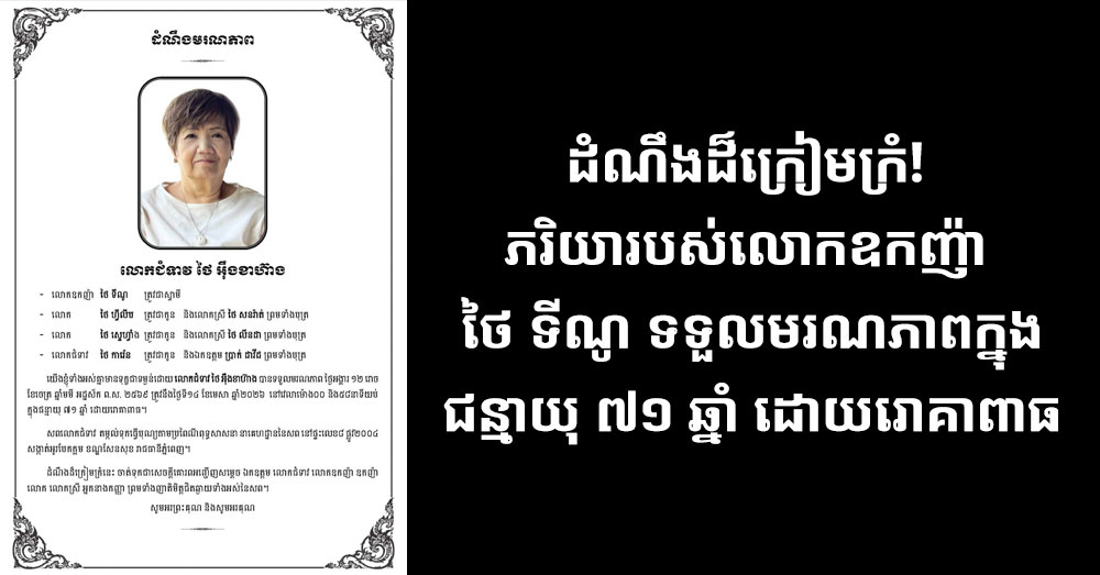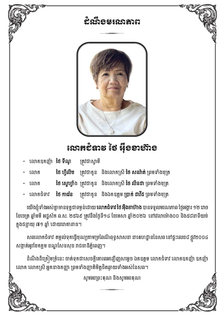 (ភ្នំពេញ)៖ លោកជំទាវ ថៃ អ៊ុងខាហ៊ាង ដែលត្រូវជាភរិយារបស់លោកឧកញ៉ា ថៃ ទីណូ បានទទួលមរណភាព ថ្ងៃអង្គារ ១២ រោច ខែចេត្រ ឆ្នាំមមី អដ្ឋស័ក ព.ស. ២៥៦៩ ត្រូវនឹងថ្ងៃទី១៤ ខែមេសា ឆ្នាំ២០២៦ នៅវេលាម៉ោង០០ និង៥៨នាទីយប់ ក្នុងជន្មាយុ ៧១ឆ្នាំ ដោយរោគាពាធ។
