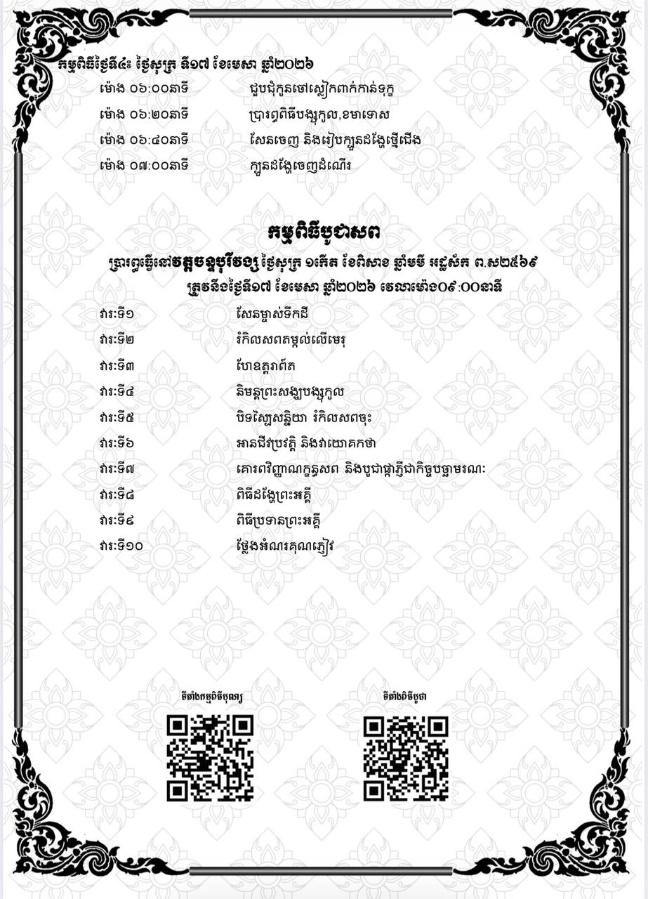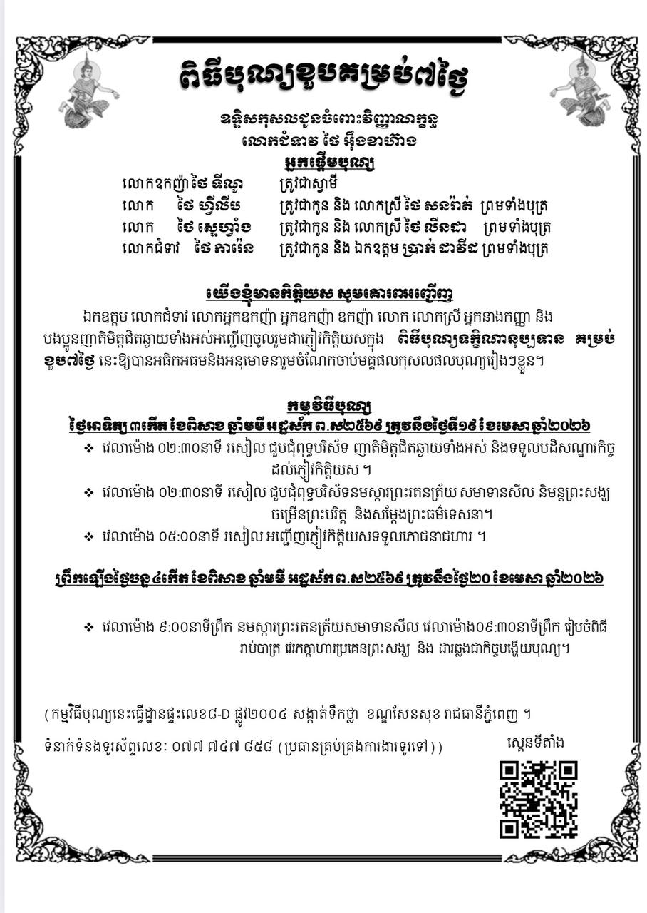 ដំណឹងដ៏ក្រៀមក្រំនេះ ចាត់ទុកជាសេចក្តីគោរពអញ្ជើញសម្តេច ឯកឧត្តម លោកជំទាវ លោកឧកញ៉ា ឧកញ៉ា លោក លោកស្រី អ្នកនាងកញ្ញា ព្រមទាំងញាតិមិត្តជិតឆ្ងាយទាំងអស់នៃសព៕