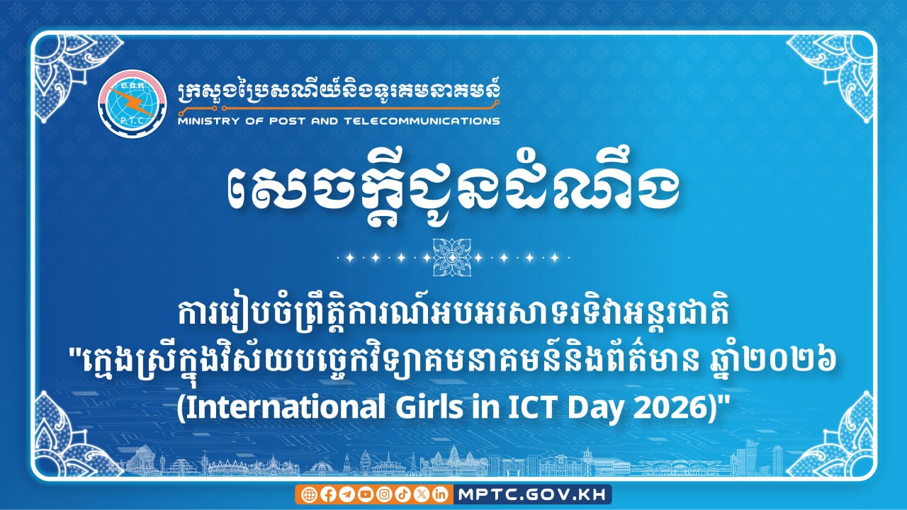 ក្រសួងប្រៃសណីយ៍ និងទូរគមនាគមន៍ ជូនដំណឹងពីការរៀបចំព្រឹត្តិការណ៍អបអរសាទរទិវាអន្តរជាតិ «ក្មេងស្រីក្នុងវិស័យបច្ចេកវិទ្យាគមនាគមន៍និងព័ត៌មាន ឆ្នាំ២០២៦»