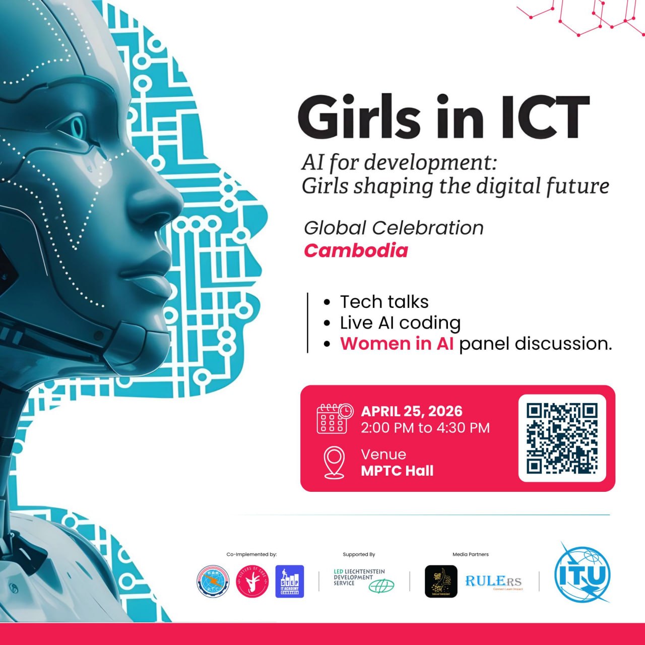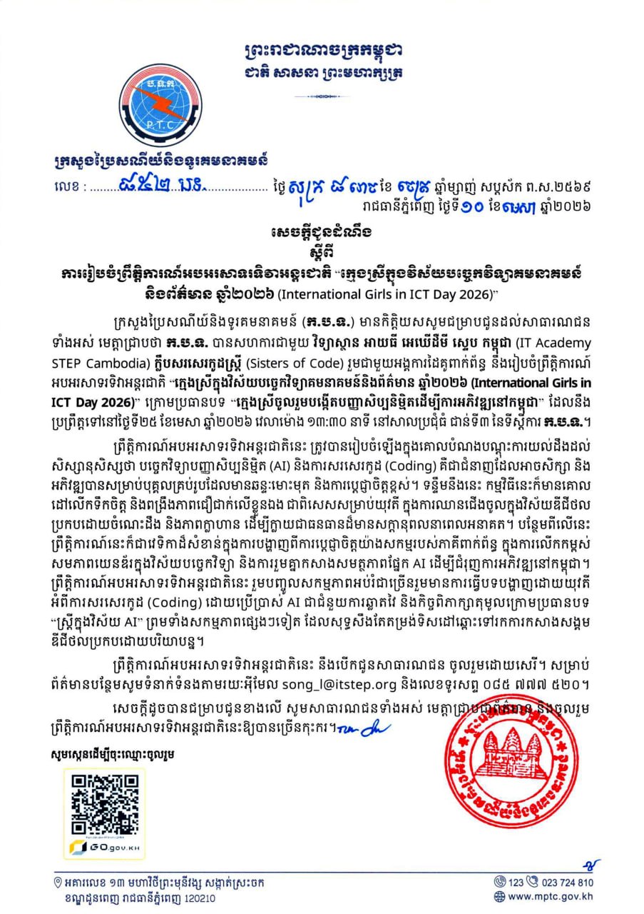 (ភ្នំពេញ)៖ ក្រសួងប្រៃសណីយ៍ និងទូរគមនាគមន៍ (ក.ប.ទ.) បានសហការជាមួយ វិទ្យាស្ថាន អាយធី អេឃើដឺមី ស្ទេប កម្ពុជា (IT Academy STEP Cambodia) ក្លឹបសរសេរកូដស្រ្តី (Sisters of Code) រួមជាមួយអង្គការដៃគូពាក់ព័ន្ធ នឹងរៀបចំព្រឹត្តិការណ៍អបអរសាទរទិវាអន្តរជាតិ “ក្មេងស្រីក្នុងវិស័យបច្ចេកវិទ្យាគមនាគមន៍និងព័ត៌មាន ឆ្នាំ២០២៦ (International Girls in ICT Day 2026)” ក្រោមប្រធានបទ “ក្មេងស្រីចូលរួមបង្កើតបញ្ញាសិប្បនិម្មិតដើម្បីការអភិវឌ្ឍនៅកម្ពុជា” ដែលនឹងប្រព្រឹត្តទៅនៅថ្ងៃទី២៥ ខែមេសា ឆ្នាំ២០២៦។
