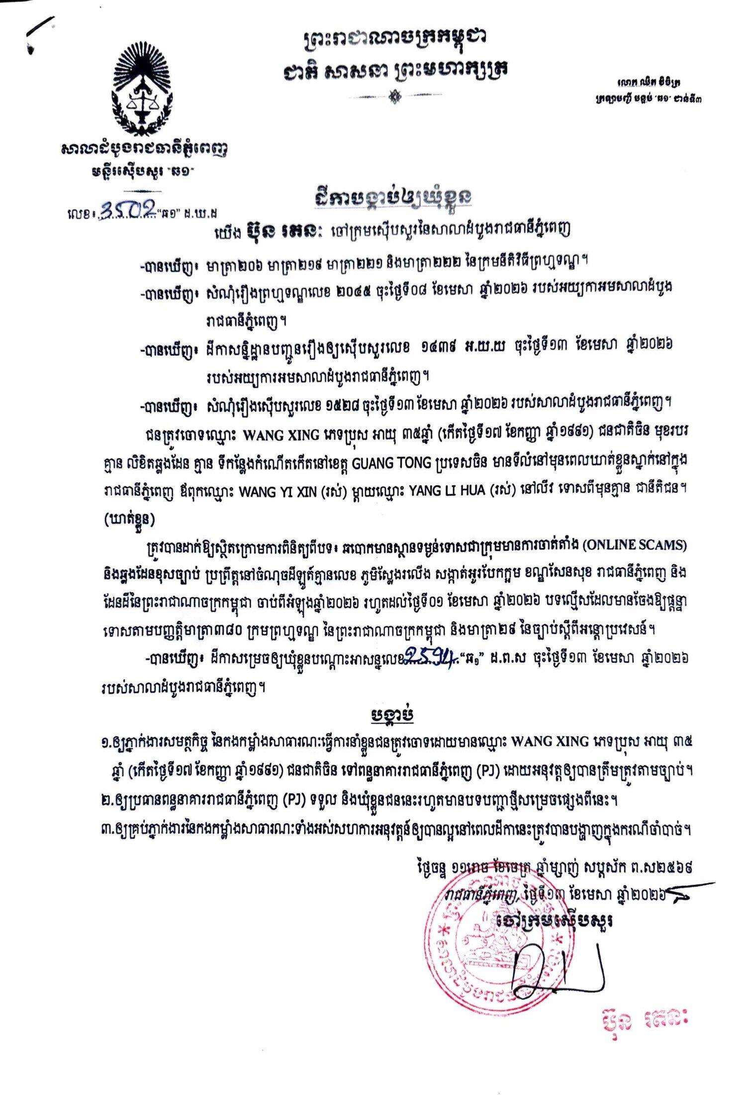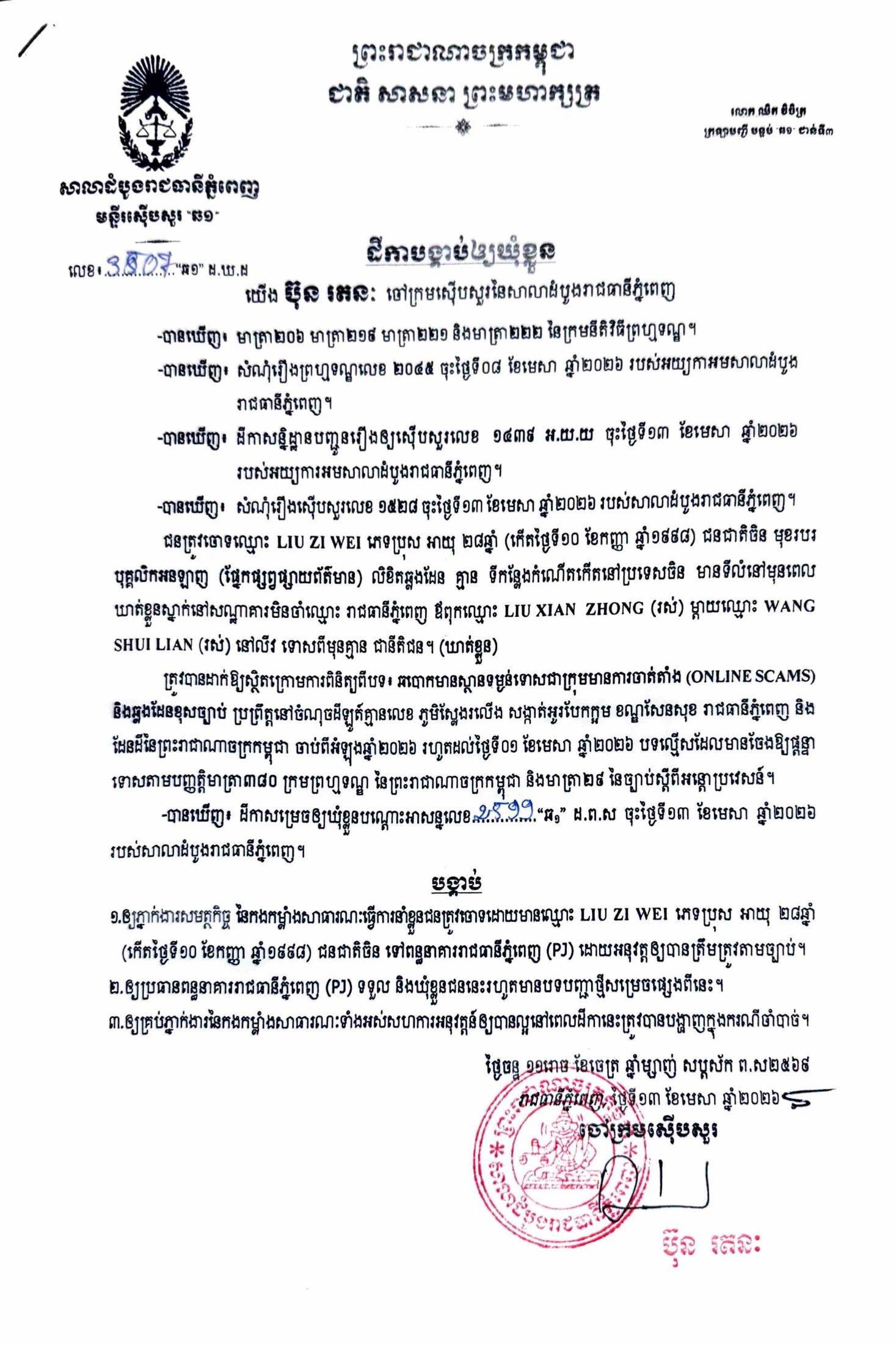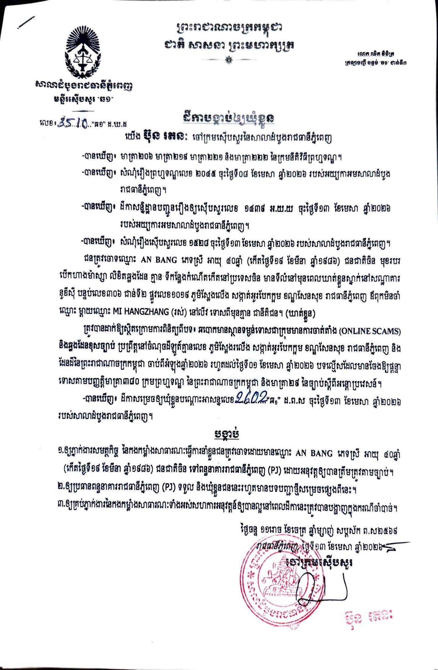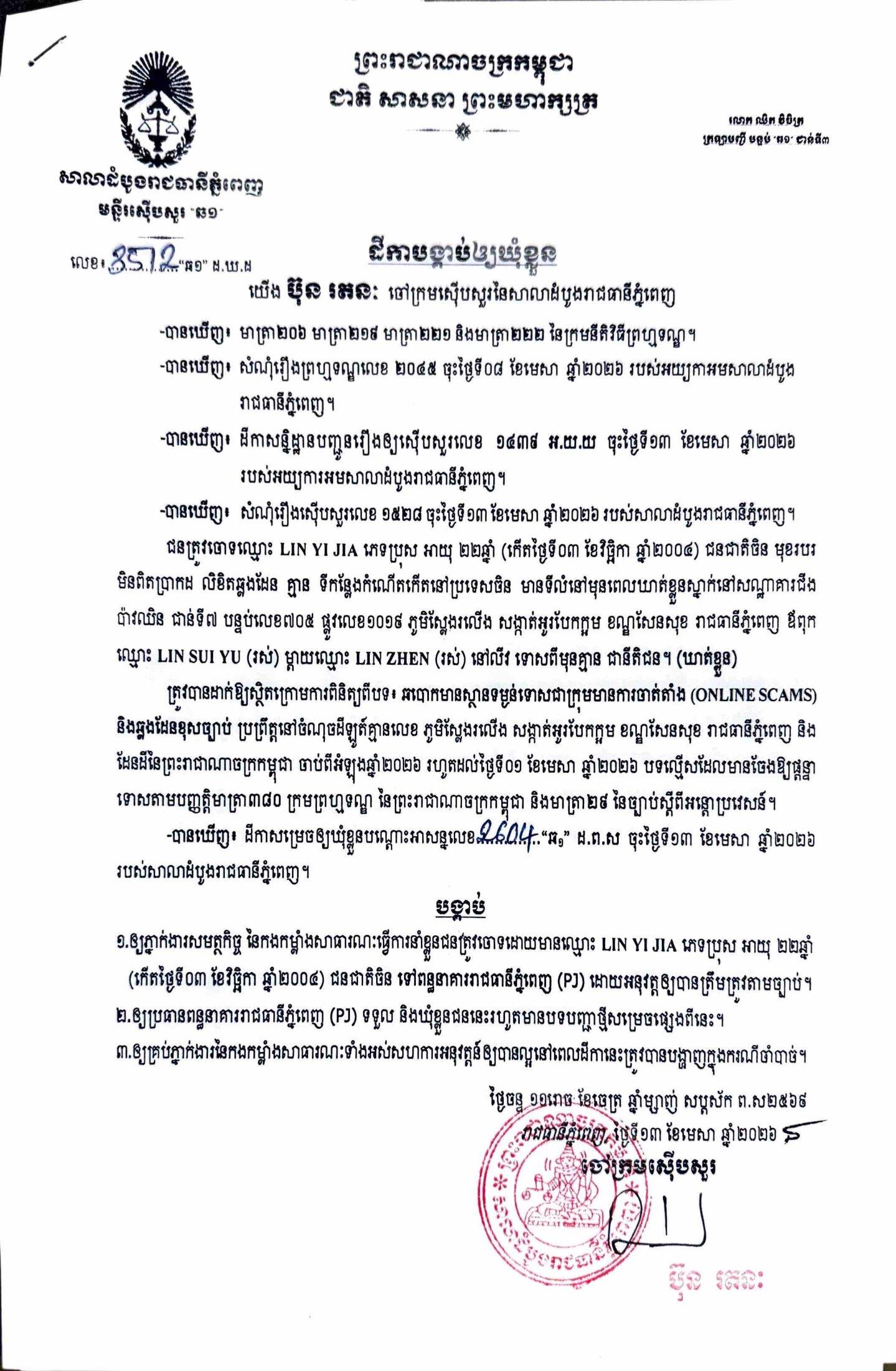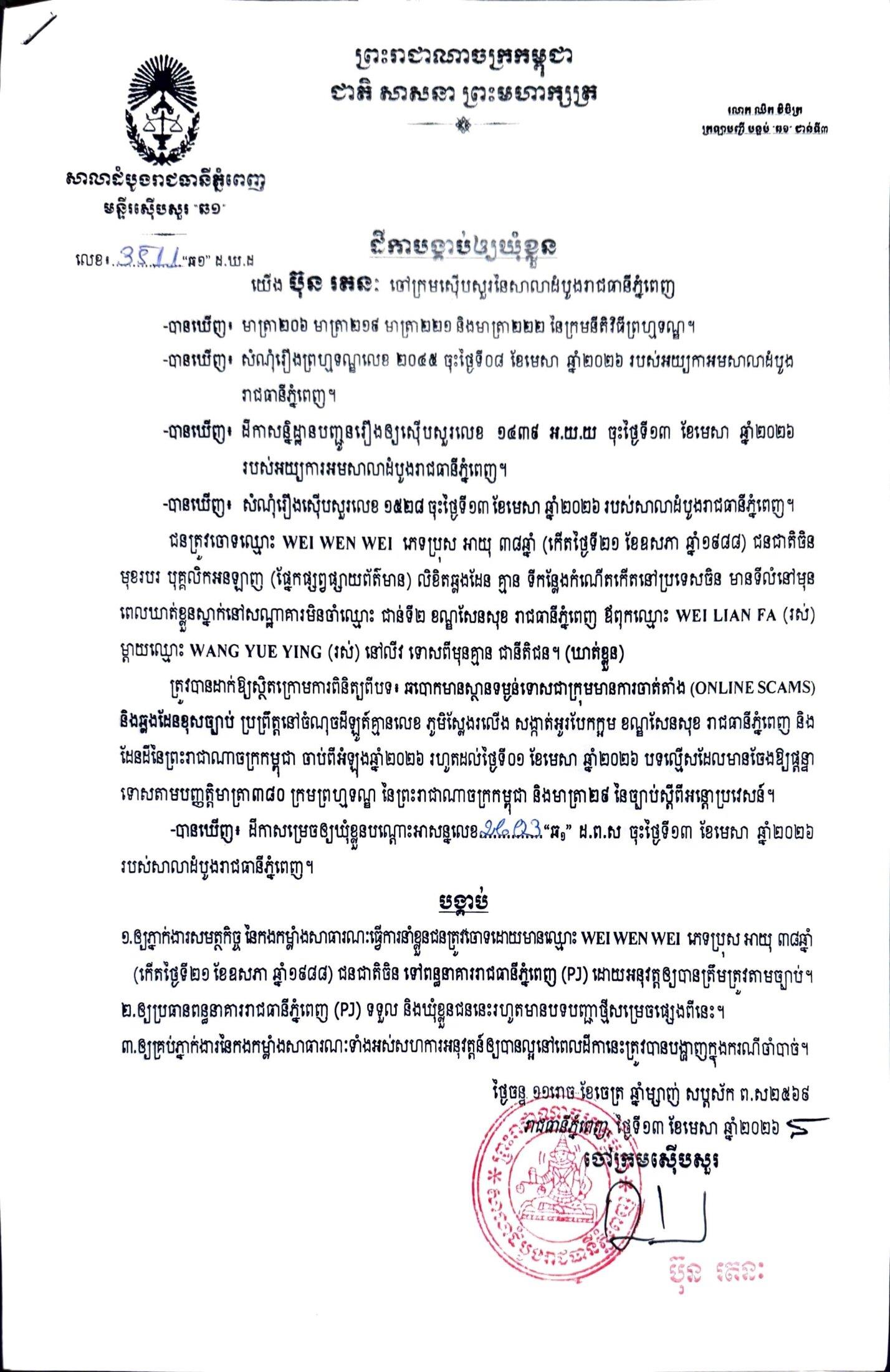 ការសម្រេចឃុំខ្លួននៅថ្ងៃទី១៣ ខែមេសា ឆ្នាំ២០២៦នេះ ក្រោយតំណាងអយ្យការអមសាលាដំបូងរាជធានីភ្នំពេញ សម្រេចចោទប្រកាន់ពីបទ ឆបោកមានស្ថានទម្ងន់ទោសជាក្រុមមានការចាត់តាំង (Online Scams)។