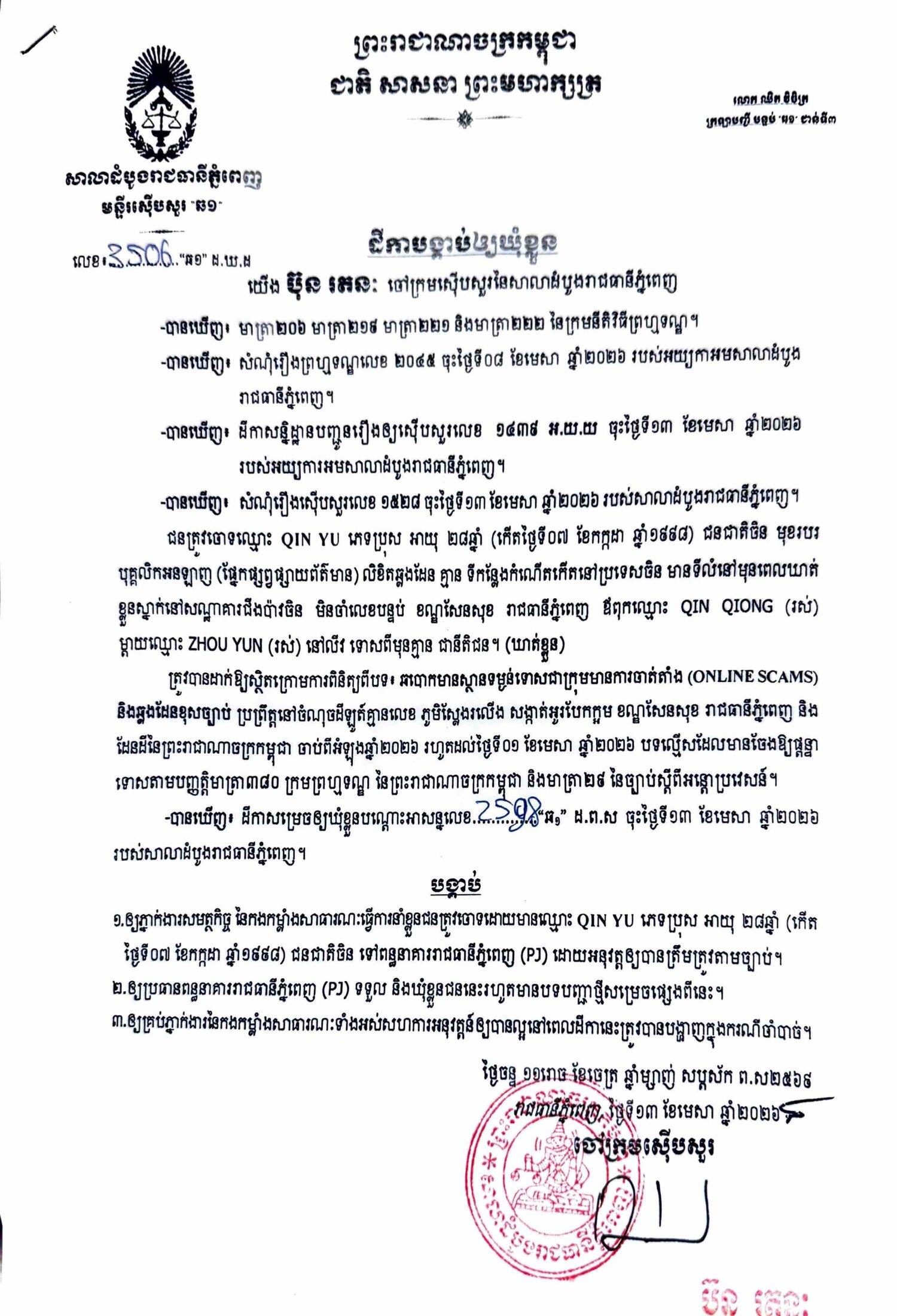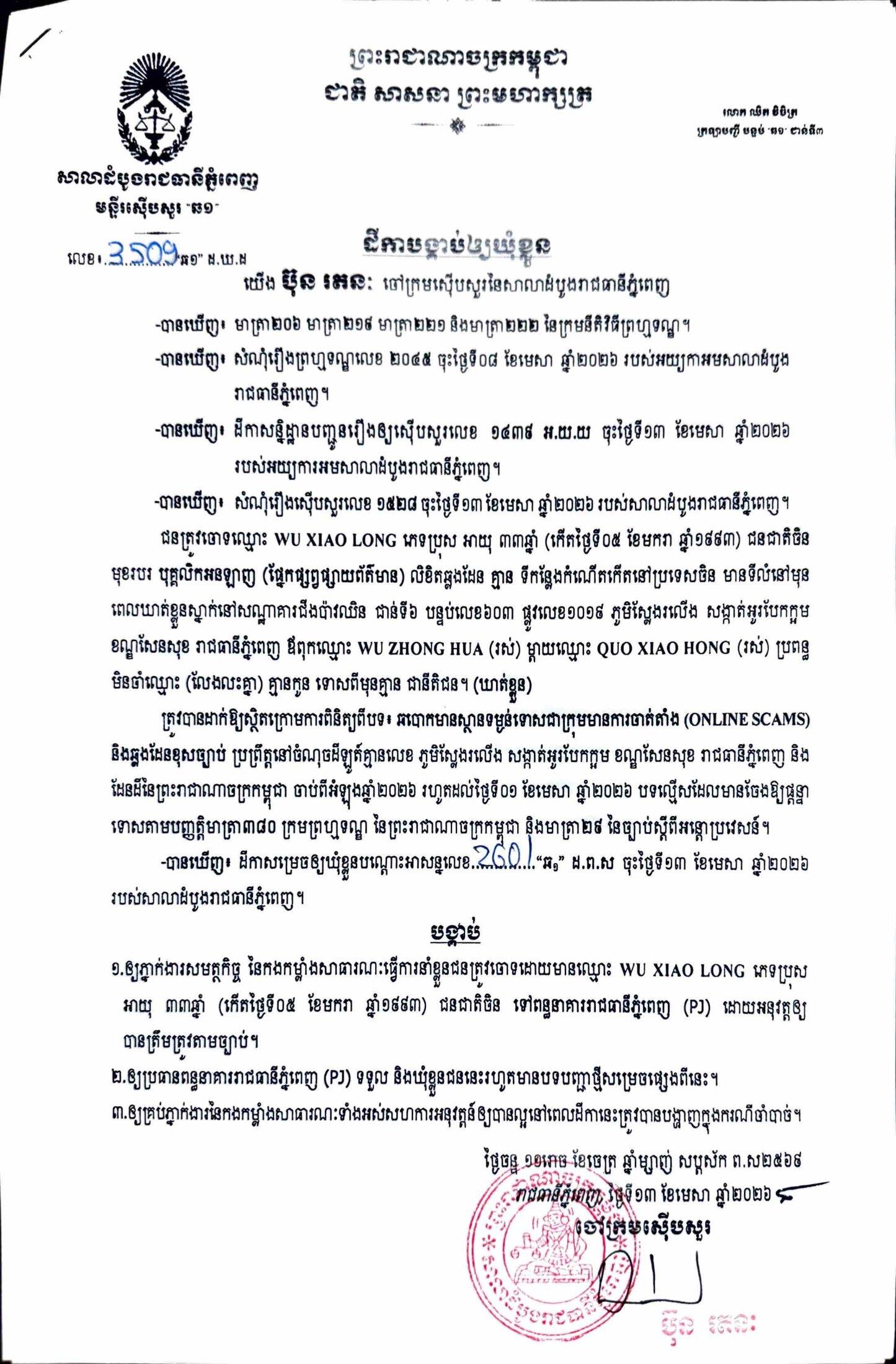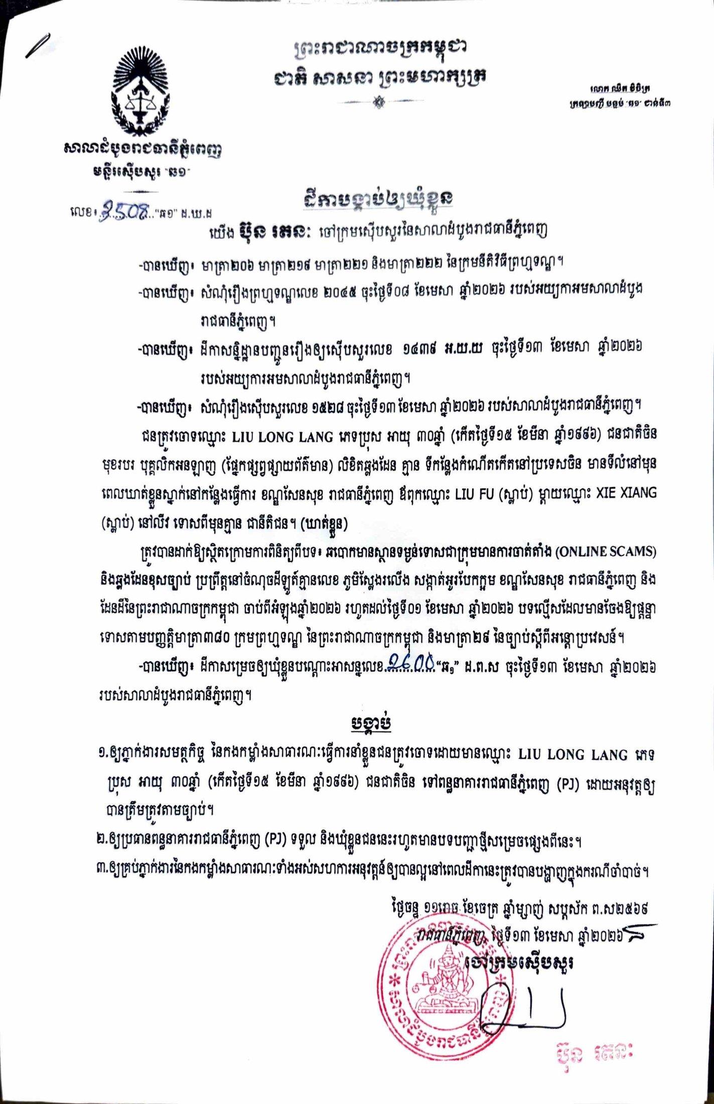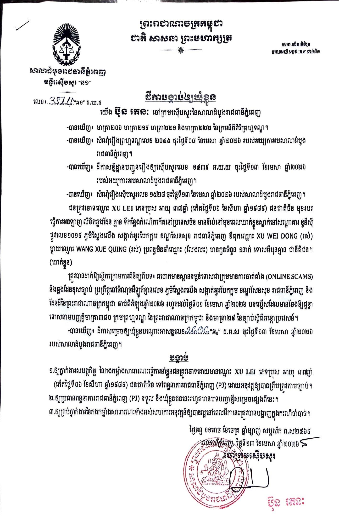 ការសម្រេចឃុំខ្លួននៅថ្ងៃទី១៣ ខែមេសា ឆ្នាំ២០២៦នេះ ក្រោយតំណាងអយ្យការអមសាលាដំបូងរាជធានីភ្នំពេញ សម្រេចចោទប្រកាន់ពីបទ ឆបោកមានស្ថានទម្ងន់ទោសជាក្រុមមានការចាត់តាំង (Online Scams)។