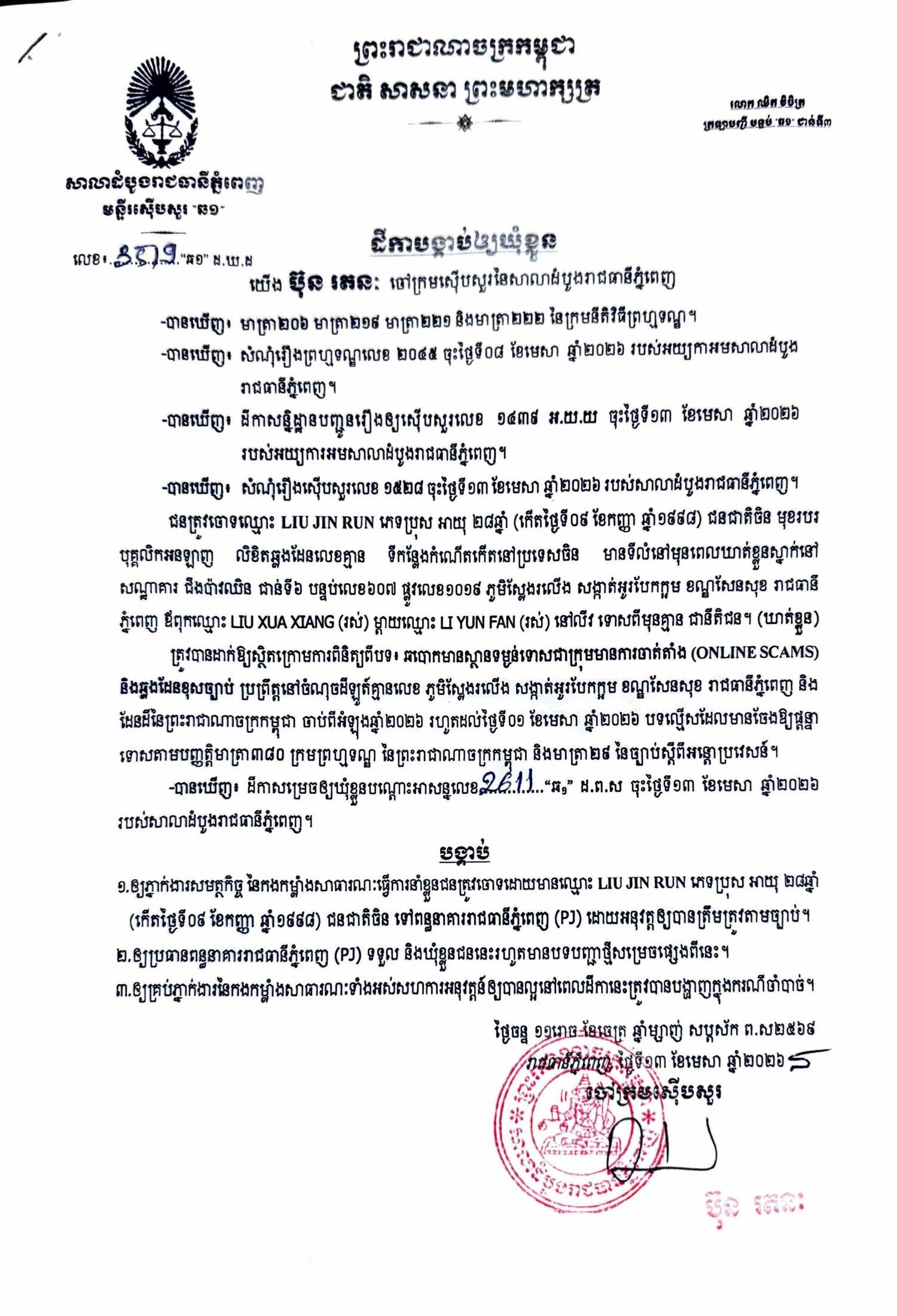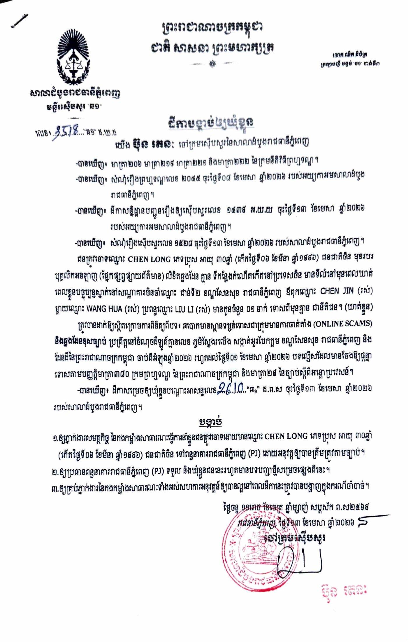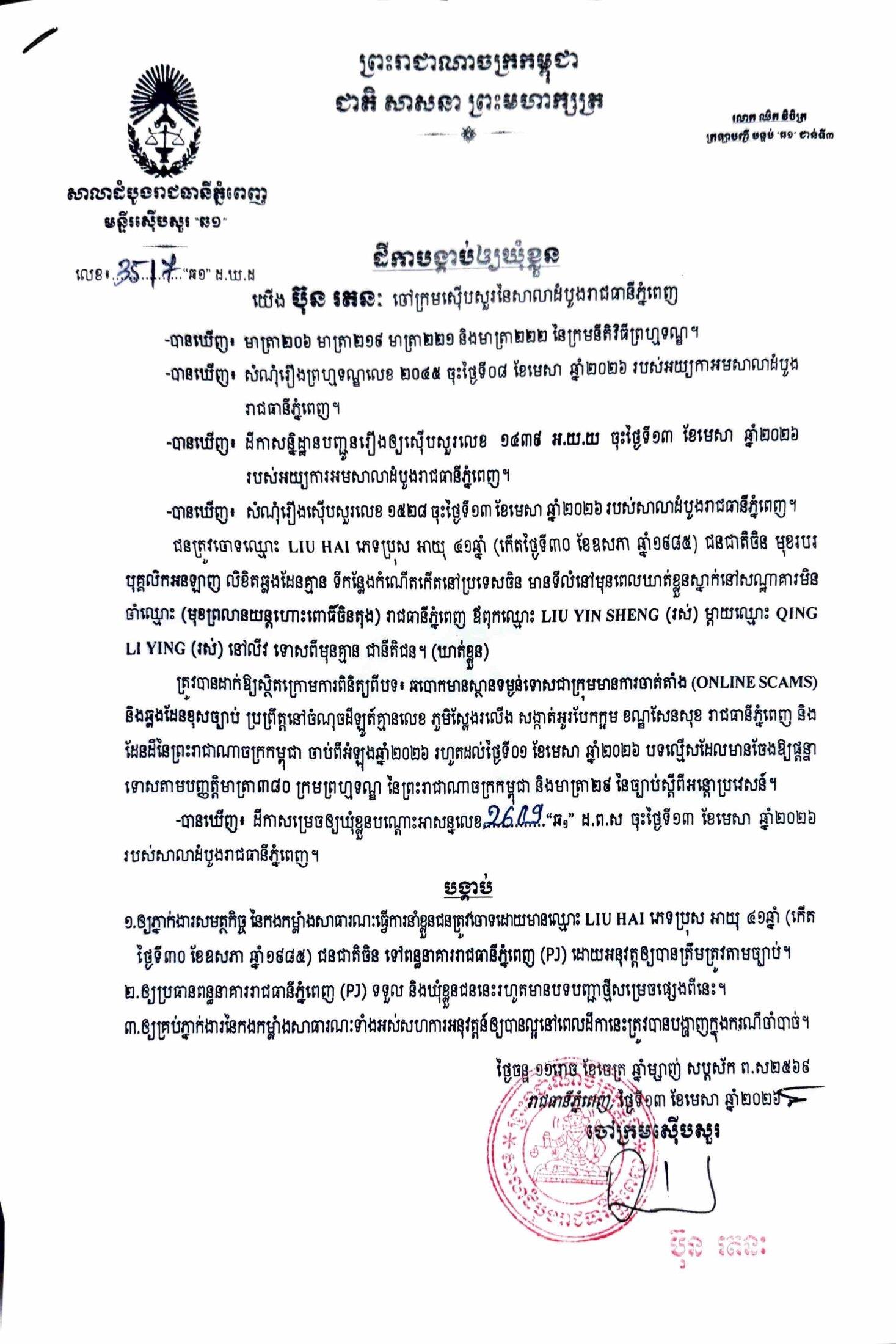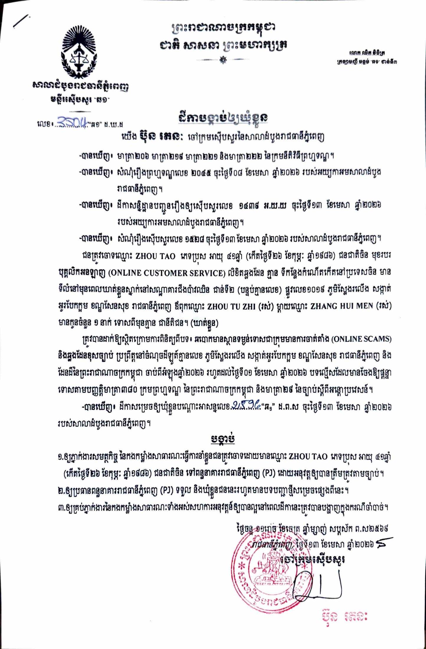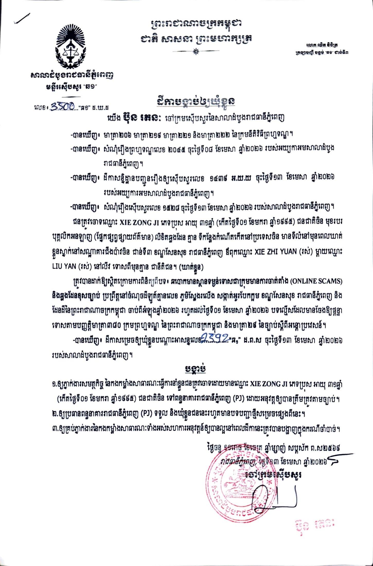 ការសម្រេចឃុំខ្លួននៅថ្ងៃទី១៣ ខែមេសា ឆ្នាំ២០២៦នេះ ក្រោយតំណាងអយ្យការអមសាលាដំបូងរាជធានីភ្នំពេញ សម្រេចចោទប្រកាន់ពីបទ ឆបោកមានស្ថានទម្ងន់ទោសជាក្រុមមានការចាត់តាំង (Online Scams)។