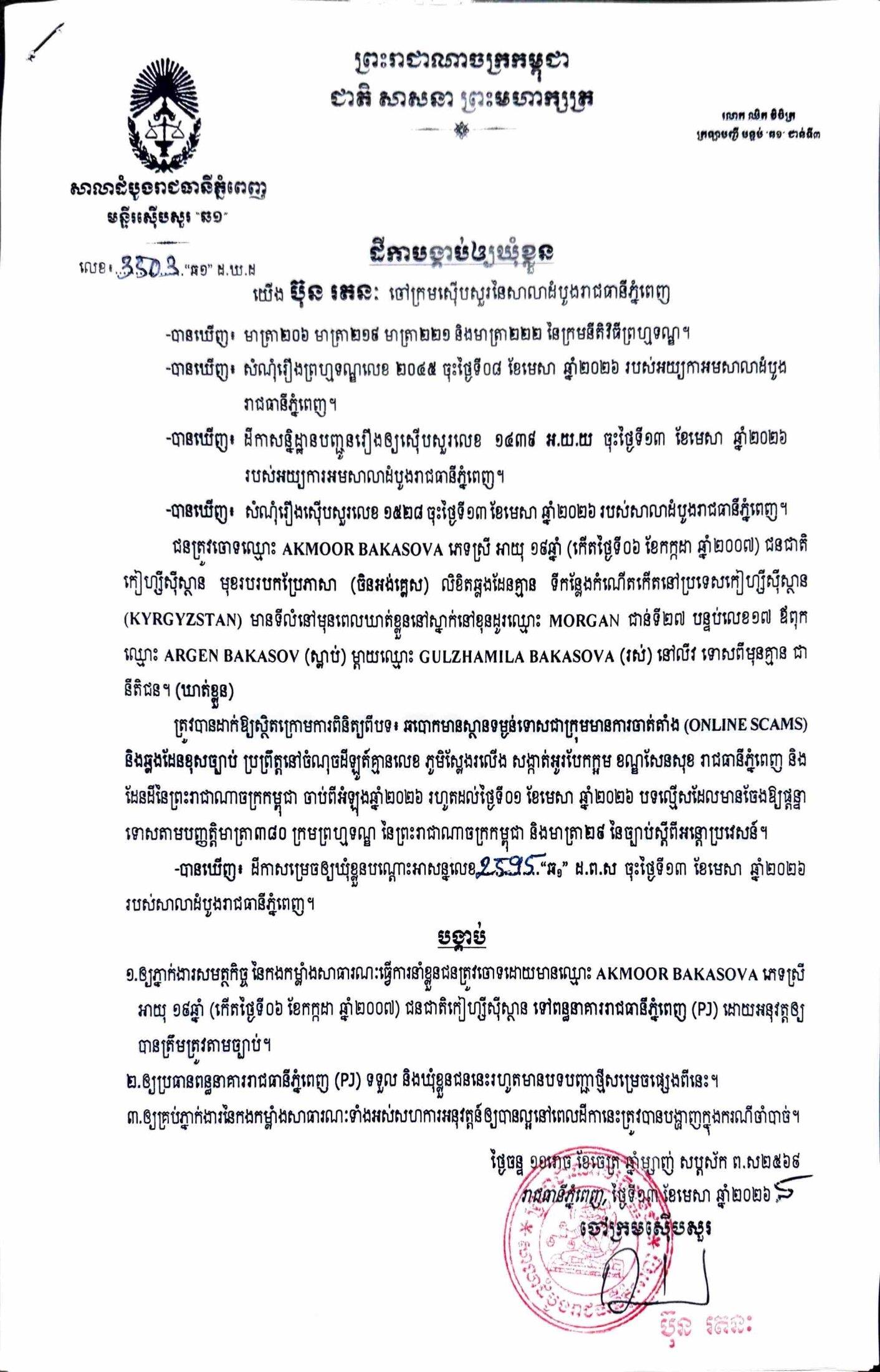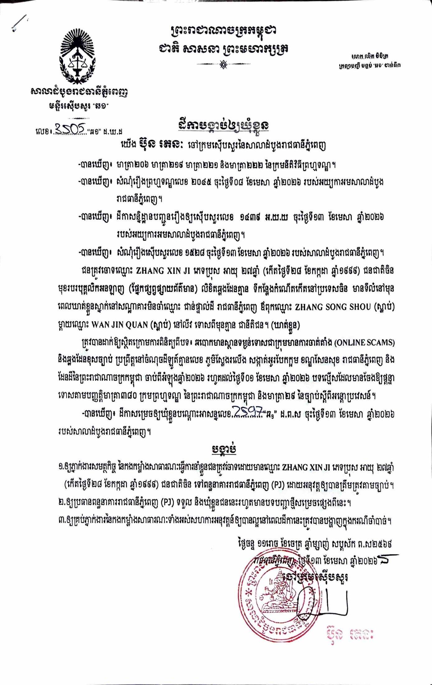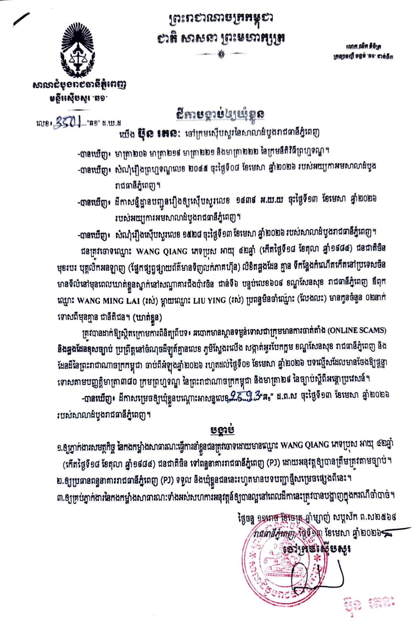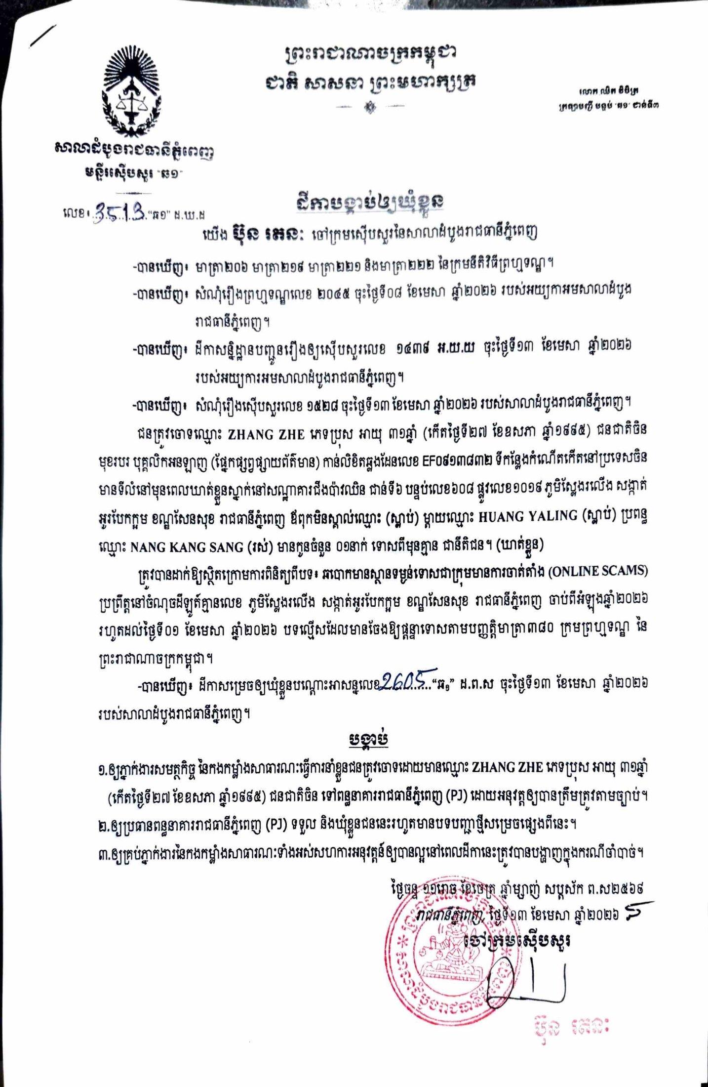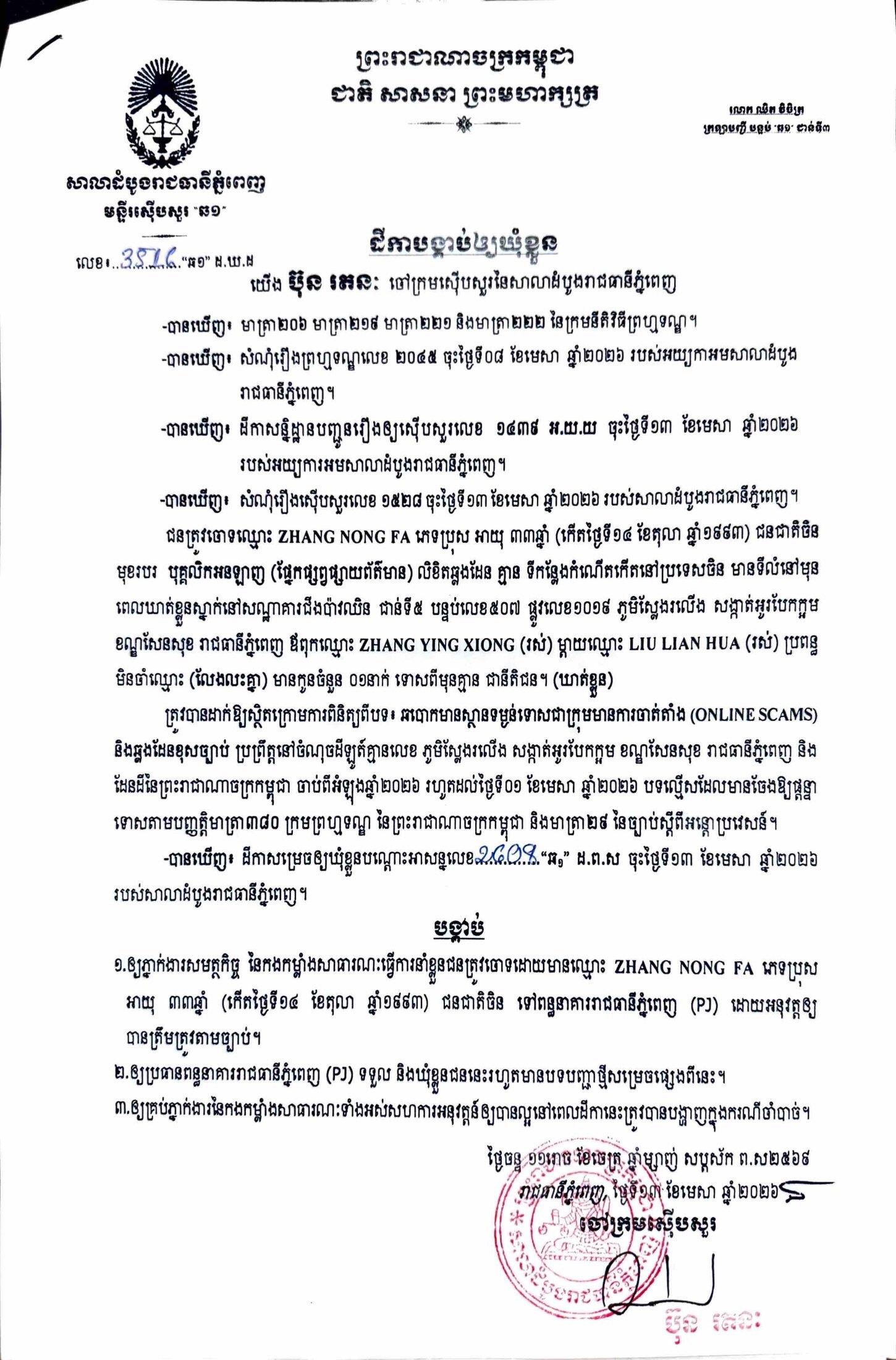 ការសម្រេចឃុំខ្លួននៅថ្ងៃទី១៣ ខែមេសា ឆ្នាំ២០២៦នេះ ក្រោយតំណាងអយ្យការអមសាលាដំបូងរាជធានីភ្នំពេញ សម្រេចចោទប្រកាន់ពីបទ ឆបោកមានស្ថានទម្ងន់ទោសជាក្រុមមានការចាត់តាំង (Online Scams)។