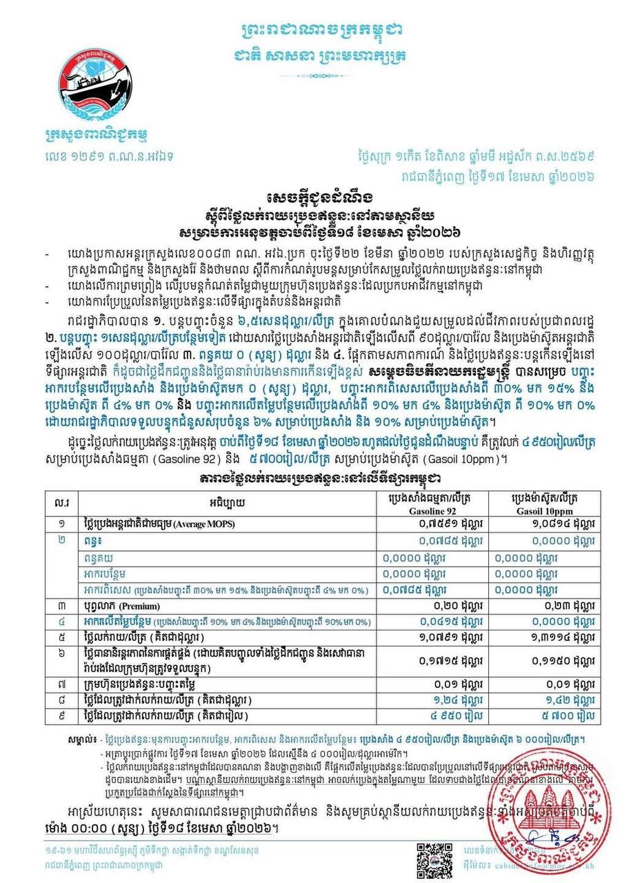 យោងតាមការជូនដំណឹងរបស់ក្រសួងពាណិជ្ជកម្ម បានឱ្យដឹងថា សម្រាប់ថ្ងៃទី១៨ ខែមេសា ឆ្នាំ២០២៦ រហូតដល់មានការជូនដំណឹងជាថ្មីនោះ ប្រេងសាំង មានតម្លៃ ៤ ៩៥០រៀល ក្នុងមួយលីត្រ ខណៈប្រេងម៉ាស៊ូត តម្លៃ ៥ ៧០០រៀល ក្នុងមួយលីត្រ។