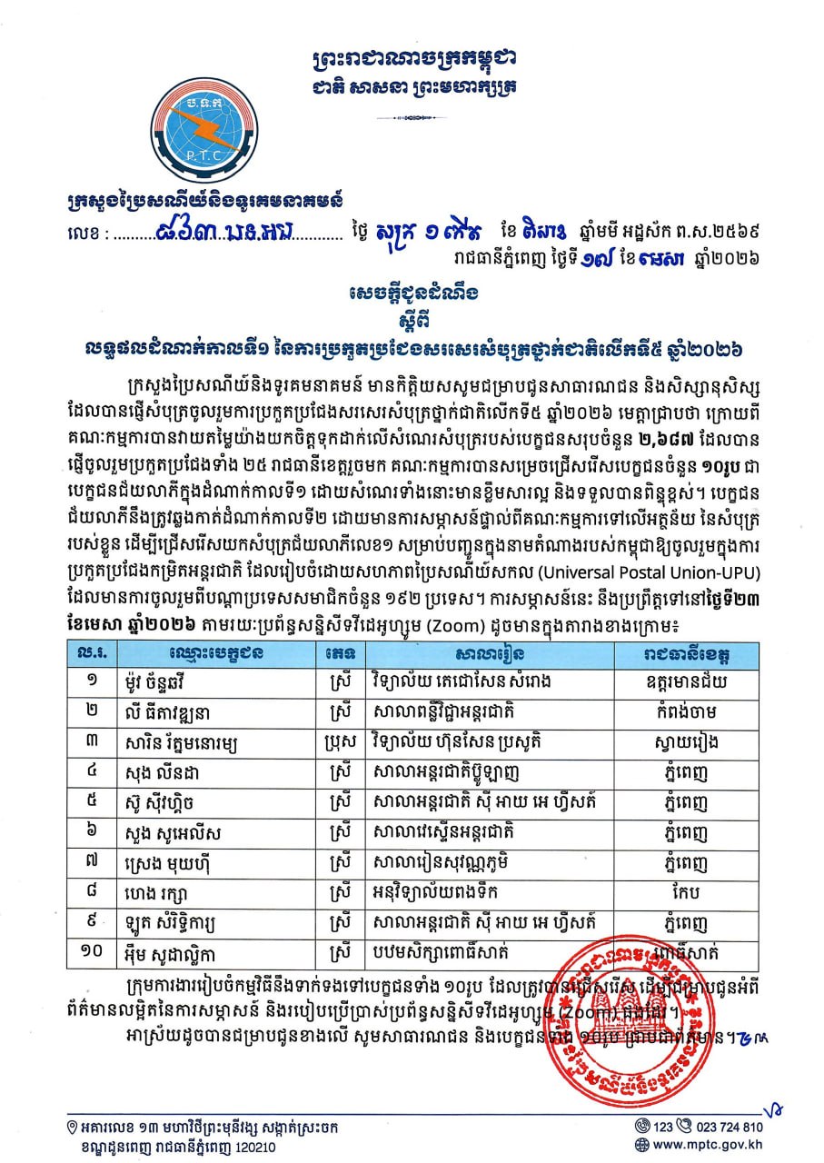 ក្រសួងប្រៃសណីយ៍ និងទូរគមនាគមន៍ ចេញសេចក្តីជូនដំណឹង ស្តីពី លទ្ធផលដំណាក់កាលទី១ នៃការប្រកួតប្រជែងសរសេរសំបុត្រថ្នាក់ជាតិ លើកទី៥ ឆ្នាំ២០២៦