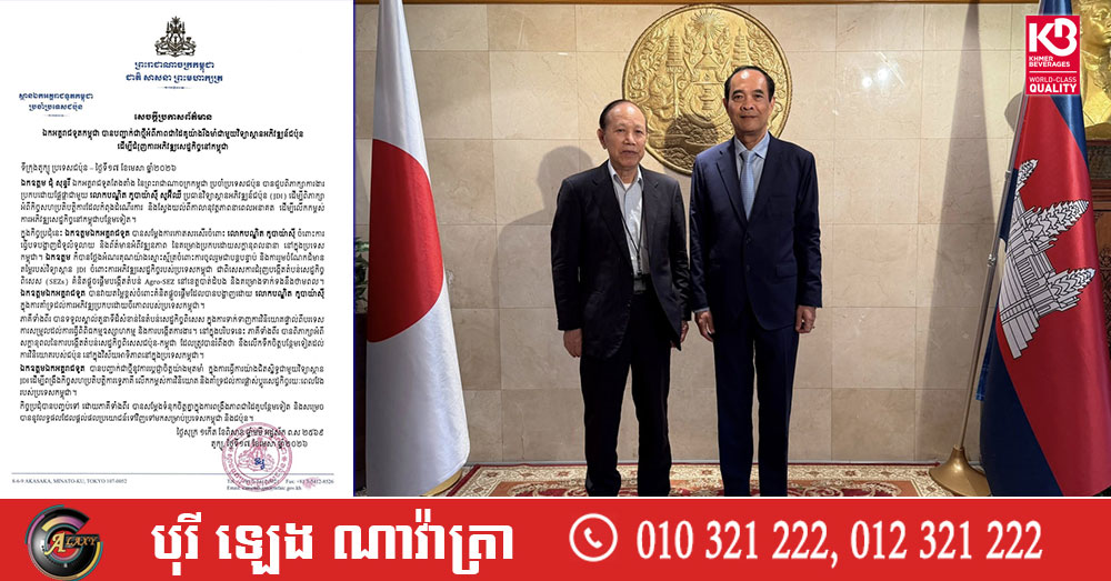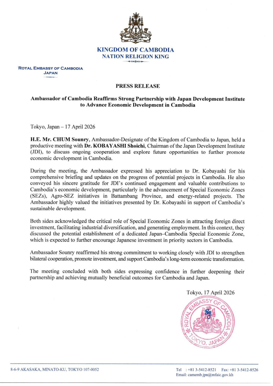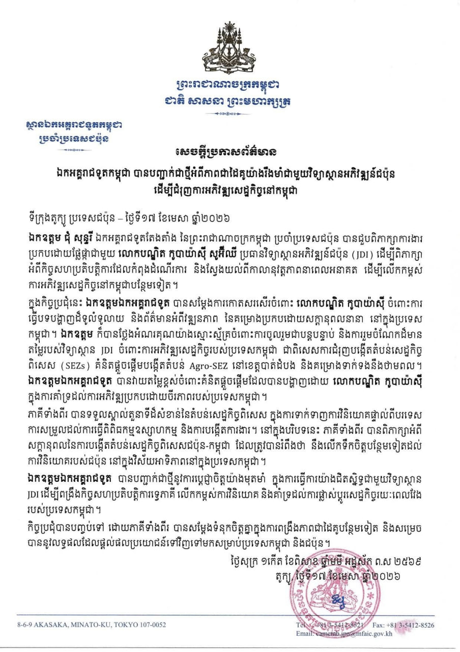 (ភ្នំពេញ)៖ លោក ជុំ សុន្ទរី ឯកអគ្គរាជទូតកម្ពុជាប្រចាំប្រទេសជប៉ុន នៅថ្ងៃទី១៧ ខែមេសា ឆ្នាំ២០២៦ បានជួបពិភាក្សាការងារប្រកបដោយផ្លែផ្កាជាមួយ លោកបណ្ឌិត កូបាយ៉ាស៊ី សូអ៊ីឈី ប្រធានវិទ្យាស្ថានអភិវឌ្ឍន៍ជប៉ុន (JDI) ដើម្បីពិភាក្សាអំពីកិច្ចសហប្រតិបត្តិការ ដែលកំពុងដំណើរការ និងស្វែងយល់ពីកាលានុវត្តភាពនាពេលអនាគត ដើម្បីលើកកម្ពស់ការអភិវឌ្ឍសេដ្ឋកិច្ចនៅកម្ពុជាបន្ថែមទៀត។