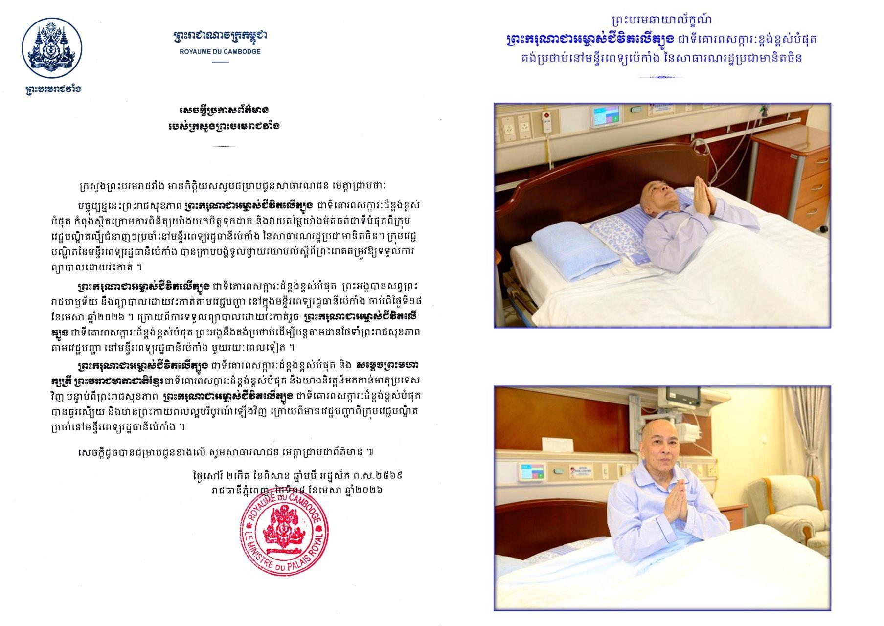 ព្រះករុណាជាអម្ចាស់ជីវិតលើត្បូង ជាទីគោរពសក្ការៈដ៏ខ្ពង់ខ្ពស់បំផុត ព្រះអង្គបានសព្វព្រះរាជហឫទ័យ នឹងព្យាបាលដោយវះកាត់តាមវេជ្ជបញ្ជា នៅក្នុងមន្ទីរពេទ្យរដ្ឋធានី ប៉េកាំង ចាប់ពីថ្ងៃទី១៨ ខែមេសា ឆ្នាំ២០២៦ ។ ក្រោយពីការទទួលព្យាបាលដោយវះកាត់រួច ព្រះករុណាជាអម្ចាស់ជីវិតលើត្បូង ជាទីគោរពសក្ការៈដ៏ខ្ពង់ខ្ពស់បំផុត ព្រះអង្គនឹងគង់ប្រថាប់ដើម្បីបន្តតាមដានថែទាំព្រះរាជសុខភាពតាមវេជ្ជបញ្ជា នៅមន្ទីរពេទ្យរដ្ឋធានីប៉េកាំង មួយរយៈពេលទៀត។
