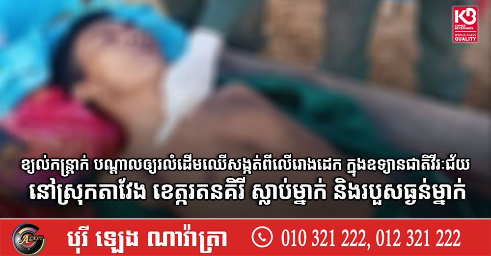 ខ្យល់កន្ត្រាក់ បណ្តាលឲ្យរលំដើមឈើសង្កត់ពីលើរោងដេក ក្នុងឧទ្យានជាតិវីរៈជ័យ នៅស្រុកតាវែង ខេត្ករតនគិរី ស្លាប់ម្នាក់ និងរបួសធ្ងន់ម្នាក់