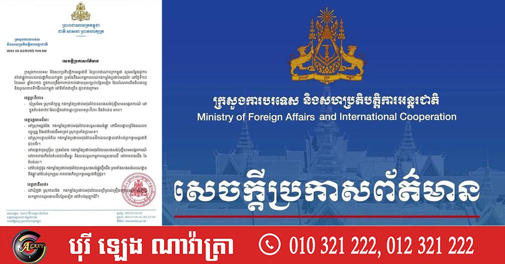 (ភ្នំពេញ)៖ ក្រសួងការបរទេស និងសហប្រតិបត្តិការអន្តរជាតិ នៃព្រះរាជាណាចក្រកម្ពុជា ចេញសេចក្តីប្រកាសព័ត៌មាន តវ៉ាជាផ្លូវការរបស់រាជរដ្ឋាភិបាលកម្ពុជា ប្រឆាំងនឹងសកម្មភាពរបស់កងកម្លាំងប្រដាប់អាវុធថៃ នៅថ្ងៃទី១៨ ខែមេសា ឆ្នាំ២០២៦ ក្នុងការពង្រឹងការកាន់កាប់ដោយខុសច្បាប់បន្ថែមទៀត ដែលរំលោភលើអធិបតេយ្យ និងបូរណភាពទឹកដីរបស់កម្ពុជា។
