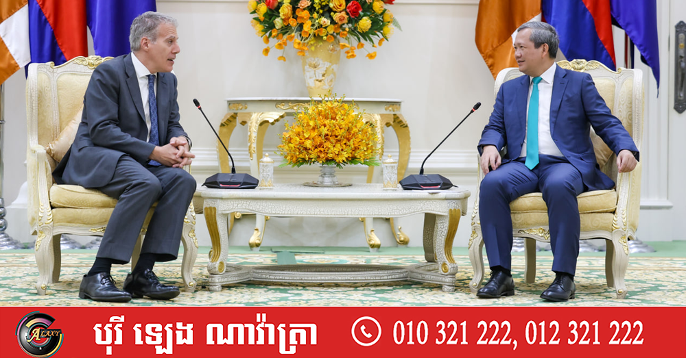 (ភ្នំពេញ)៖ នៅព្រឹកថ្ងៃចន្ទ ទី២០ ខែមេសា ឆ្នាំ២០២៦នេះ សម្តេចមហាបវរធិបតី ហ៊ុន ម៉ាណែត នាយករដ្ឋមន្ត្រីកម្ពុជា បានអនុញ្ញាតឱ្យលោក Christian DesRoches ឯកអគ្គរដ្ឋទូតប្រទេសកាណាដា ប្រចាំនៅកម្ពុជា ចូលជួបសម្តែងការគួរសម និងពិភាក្សាការងារ នៅវិមានសន្តិភាព៕