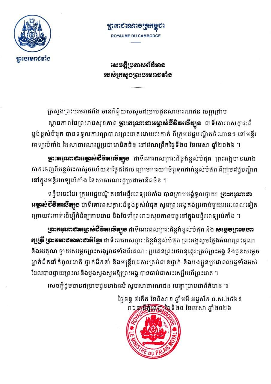 សម្តេចតេជោ បញ្ជាក់ថា ក្នុងករណីព្រះរាជសុខភាពព្រះមហាក្សត្របានប្រសើរ ខ្ញុំព្រះករុណានឹងត្រឡប់ទៅប្រទេសវិញ នៅថ្ងៃ២២ ខែមេសា ឆ្នាំ២០២៦៕