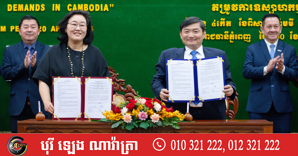 (ភ្នំពេញ)៖ លោក ហេង សួរ រដ្ឋមន្ត្រីក្រសួងការងារ និងបណ្ដុះបណ្ដាលវិជ្ជាជីវៈ និងលោកស្រី ឆយ ម៉ូន ជុង (CHOI Moon Jung) នាយិកាទីភ្នាក់ងារសហប្រតិបត្តិការអន្តរជាតិកូរ៉េ (KOICA) ប្រចាំកម្ពុជា នារសៀលថ្ងៃទី២០ ខែមេសា ឆ្នាំ២០២៦ បានចុះហត្ថលេខាលើកំណត់ហេតុនៃកិច្ចពិភាក្សាស្តីពី «គម្រោងអភិវឌ្ឍកម្លាំងពលកម្មជំនាញ ដើម្បីឆ្លើយតបតម្រូវការឧស្សាហកម្មនៅកម្ពុជា» នៅទីស្តីការក្រសួង។