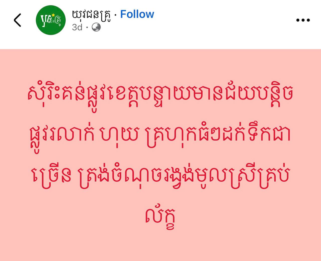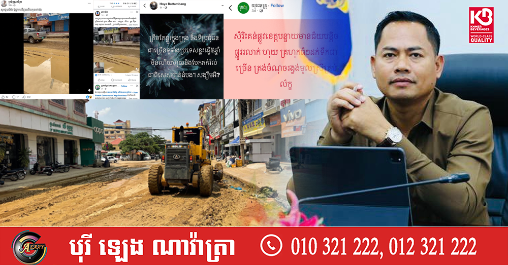 (ភ្នំពេញ)៖ ជុំវិញបញ្ហាកង្វល់របស់បងប្អូនប្រជាពលរដ្ឋ ក្នុងក្រុងសិរីសោភ័ណ នៃខេត្តបន្ទាយមានជ័យ លើបញ្ហាផ្លូវពិបាកធ្វើដំណើរ និងមានរូបភាពទឹកដក់លើដងផ្លូវនេះបណ្តាលមកពីភ្លៀងកក់ខែ លោក ផន រឹម អ្នកនាំពាក្យក្រសួងសាធារណការ និងដឹកជញ្ជូន បានបញ្ជាក់ឱ្យដឹងថា ទីតាំងនេះជាអនុគម្រោងសាងសង់សាងសង់ប្រព័ន្ធលូ និងស្ថានីយប្រព្រឹត្តកម្មទឹកកខ្វក់ក្រុងសិរីសោភ័ណ ហើយមកដល់ពេលនេះក្រុមការងារបានកែលម្អ ដើម្បីសម្រួលដល់ការធ្វើដំណើររបស់បងប្អូនប្រជាពលរដ្ឋជាប្រក្រតីរួចរាល់ហើយ។