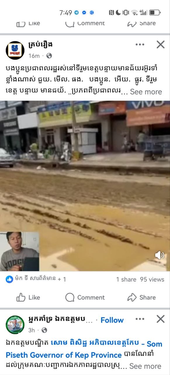 លោក ផន រឹម បានបន្ថែមថា អ្វីដែលលោកអ្នកបានឃើញរូបភាពទឹកដក់លើដងផ្លូវនេះ បណ្តាលមកពីភ្លៀងកក់ខែធ្លាក់ជាប់ៗគ្នារយៈពេល ២ថ្ងៃ បន្ទាប់ពីក្រុមការងារការដ្ឋានបានកាយដាក់ទុយោ និងបានបង្ហាប់ដីតួផ្លូវ កាលពីអំឡុងបុណ្យចូលឆ្នាំថ្មី ប្រពៃណីជាតិខ្មែរ។ បច្ចុប្បន្ននេះក្រុមការងារបានកែលម្អ ដើម្បីសម្រួលដល់ការធ្វើដំណើររបស់បងប្អូនប្រជាពលរដ្ឋជាប្រក្រតីរួចរាល់ ហើយអាជ្ញាធរក្រុង-ខេត្ត ដ៏ដូចជាមន្ត្រីអនុវត្តន៍គម្រោង បានយកចិត្តទុកដាក់ខ្ពស់ពីសុខទុក្ខ និងតម្រូវការរបស់បងប្អូនប្រជាពលរដ្ឋផងដែរ។