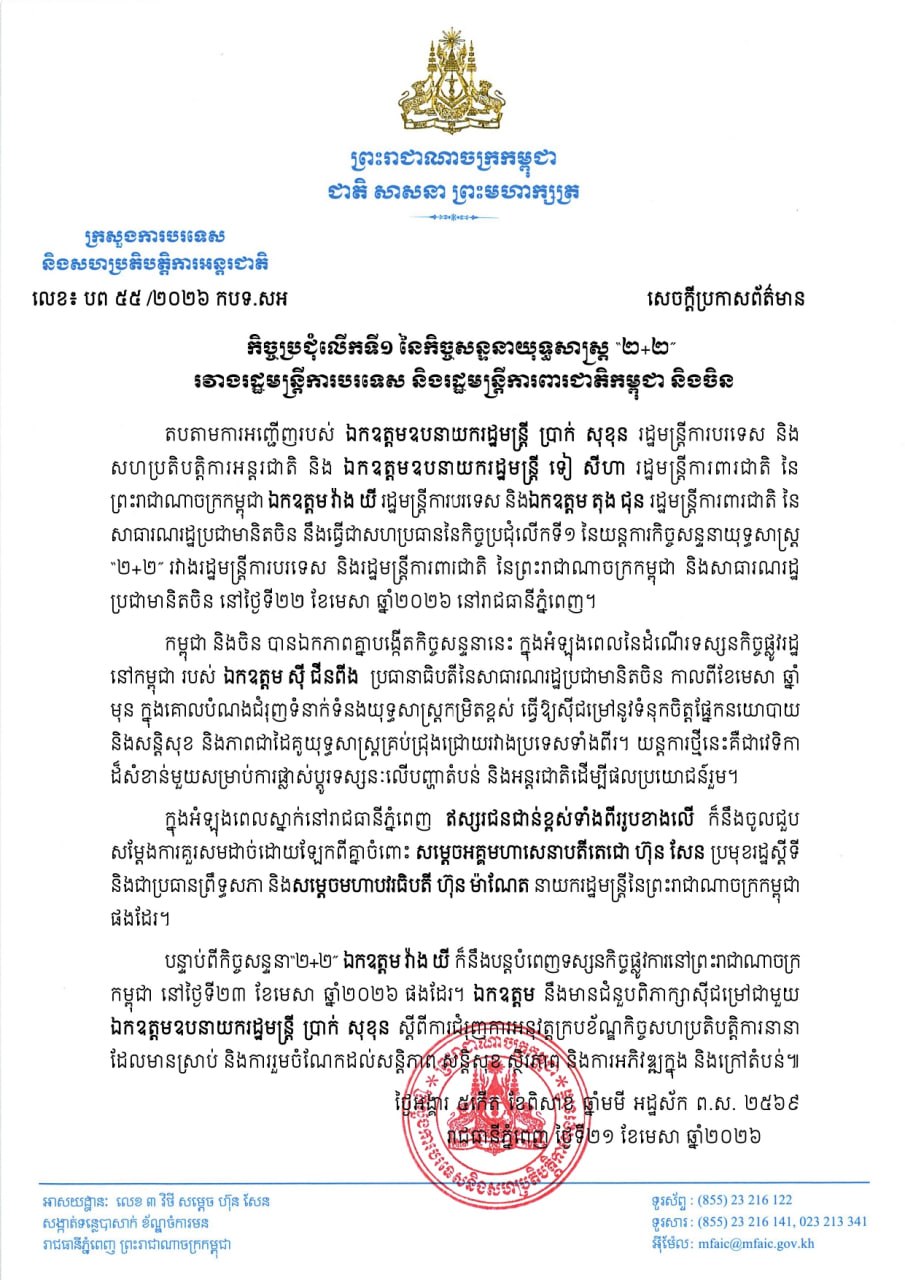 (ភ្នំពេញ)៖ តបតាមការអញ្ជើញរបស់ ឧបនាយករដ្ឋមន្ត្រី ប្រាក់ សុខុន រដ្ឋមន្ត្រីការបរទេស និង សហប្រតិបត្តិការអន្តរជាតិ និងឧបនាយករដ្ឋមន្ត្រី ទៀ សីហា រដ្ឋមន្ត្រីការពារជាតិ នៃ ព្រះរាជាណាចក្រកម្ពុជា លោក វ៉ាង យី រដ្ឋមន្ត្រីការបរទេស និងលោក តុង ជុន រដ្ឋមន្ត្រីការពារជាតិ នៃសាធារណរដ្ឋប្រជាមានិតចិន នឹងធ្វើជាសហប្រធាននៃកិច្ចប្រជុំលើកទី១ នៃយន្តការកិច្ចសន្ទនាយុទ្ធសាស្ត្រ «២+២» រវាងរដ្ឋមន្ត្រីការបរទេស និងរដ្ឋមន្ត្រីការពារជាតិ នៃព្រះរាជាណាចក្រកម្ពុជា និងសាធារណរដ្ឋ ប្រជាមានិតចិន នៅថ្ងៃទី២២ ខែមេសា ឆ្នាំ២០២៦ នៅរាជធានីភ្នំពេញ។