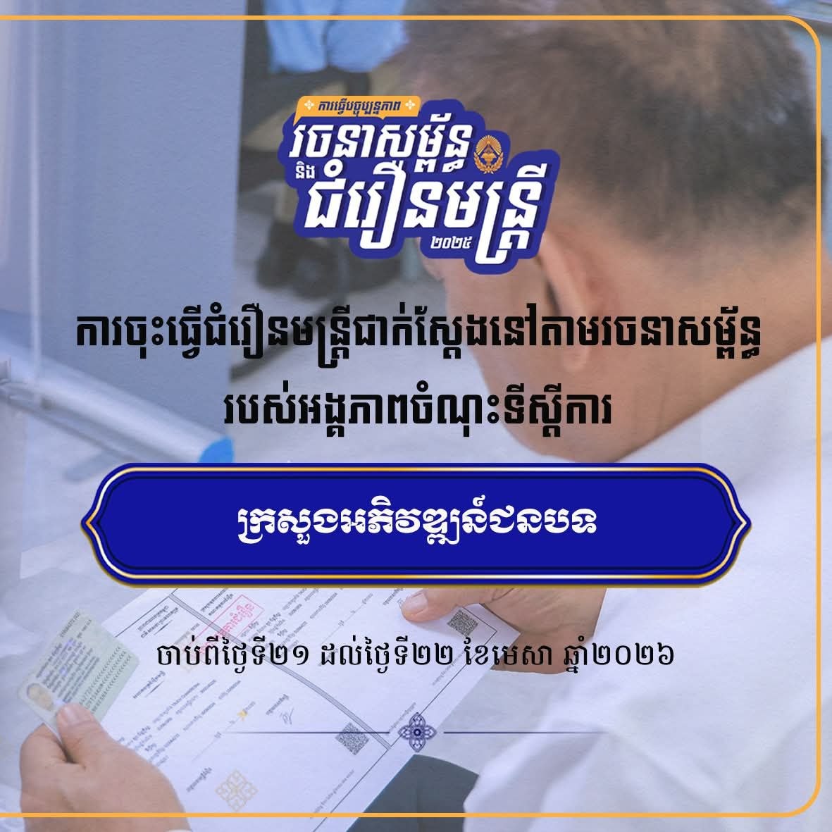ការធ្វើបច្ចុប្បន្នភាពរចនាសម្ព័ន្ធ និងជំរឿនមន្ត្រីជាក់ស្តែងនៅតាមរចនាសម្ព័ន្ធរបស់អង្គភាពចំណុះទីស្តីការក្រសួងអភិវឌ្ឍន៍ជនបទ ប្រព្រឹត្តទៅរយៈពេល២ថ្ងៃពេញ ពោលគឺថ្ងៃទី២១ និងទី២២ ខែមេសា ឆ្នាំ២០២៦ នៅអគារនៃទីស្តីការក្រសួងអភិវឌ្ឍន៍ជនបទ ដើម្បីការធានាមិនឱ្យប៉ះពាល់ដល់ដំណើរការនៃការងារប្រចាំថ្ងៃរបស់មន្ត្រី ហើយក៏មិនឱ្យប៉ះពាល់ដល់ដំណើរការនៃការផ្តល់សេវាសាធារណៈរបស់អង្គភាព ដែលជាគោលដៅនៃការធ្វើជំរឿន។