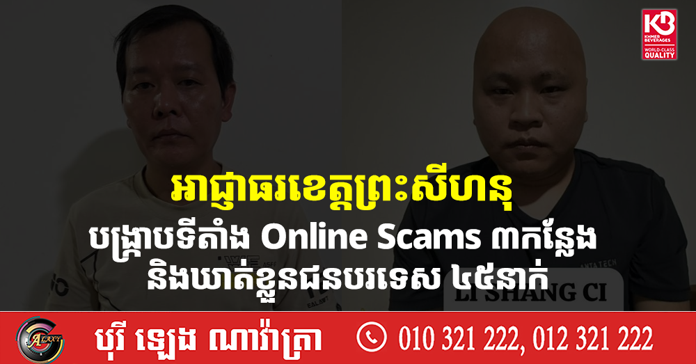អាជ្ញាធរខេត្តព្រះសីហនុ បង្ក្រាបទីតាំង Online Scams ៣កន្លែង និងឃាត់ខ្លួនជនបរទេស ៤៥នាក់