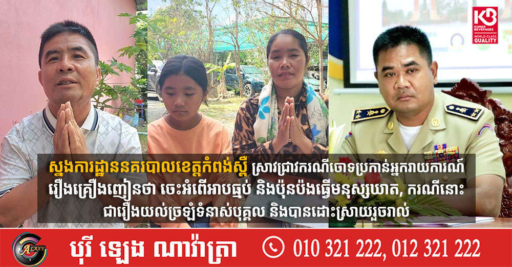 ស្នងការដ្ឋាននគរបាលខេត្តកំពង់ស្ពឺ ស្រាវជ្រាវករណីចោទប្រកាន់អ្នករាយការណ៍រឿងគ្រឿងញៀនថា ចេះអំពេីអាបធ្មប់ និងប៉ុនប៉ងធ្វេីមនុស្សឃាត, ករណីនោះជារឿងយល់ច្រឡំទំនាស់បុគ្គល និងបានដោះស្រាយរួចរាល់