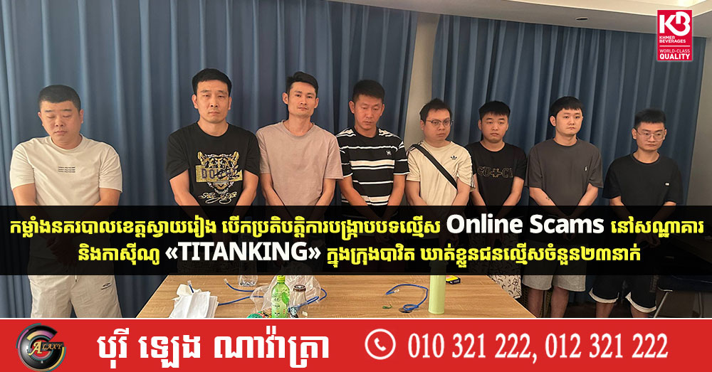 កម្លាំងនគរបាលខេត្តស្វាយរៀង បើកប្រតិបត្តិការបង្ក្រាបបទល្មើស Online Scams នៅសណ្ឋាគារ និងកាស៊ីណូ «TITANKING» ក្នុងក្រុងបាវិត ឃាត់ខ្លួនជនល្មើសចំនួន២៣នាក់