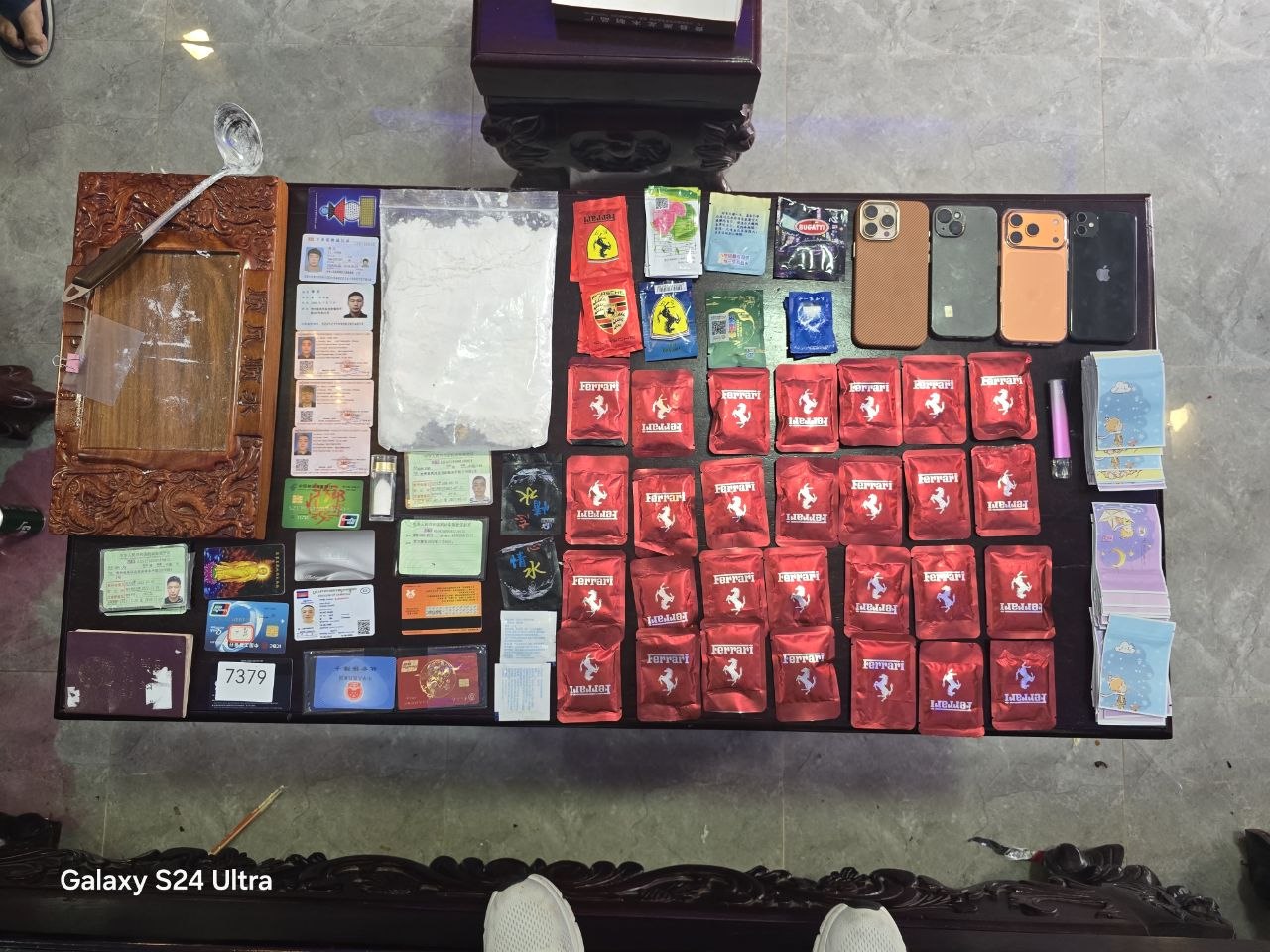 នៅវេលាម៉ោង១៣:០០នាទី កម្លាំងជំនាញ បន្តចុះទៅចំណុចផ្ទះវីឡាមួយកន្លែង ស្ថិតក្នុងភូមិ៣ សង្កាត់លេខ១ ក្រុង- ខេត្តព្រះសីហនុ បានបន្តឃាត់ខ្លួនជនសង្ស័យ ចំនួន ០១នាក់បន្ថែមទៀត ឈ្មោះ YANG YANG ភេទប្រុស អាយុ៣៦ឆ្នាំ ជនជាតិចិន មុខរបរមិនពិតប្រាកដ ស្នាក់នៅភូមិ៣ សង្កាត់លេខ១ ក្រុង- ខេត្តព្រះសីហនុ។ សមត្ថកិច្ចបានដកហូតវត្ថុតាងរួមមាន៖ ទូរសព្ទដៃ ចំនួន ០៤គ្រឿង,លិខិតឆ្លងដែន ចំនួន ០១ច្បាប់, បណ្ណបើកបរសាធារណៈរដ្ឋប្រជាមានិតចិន ចំនួន ០២សន្លឹក, បណ្ណបើកបរព្រះរាជាណាចក្រកម្ពុជា ចំនួន ០១សន្លឹក, អត្តសញ្ញាណបណ្ណសញ្ជាតិចិន ចំនួន ០១សន្លឹក,បណ្ណចេញចូលហុងកុង ចំនួន ០១សន្លឹក,សៀវភៅការងារជនបរទេស ចំនួន ០៣សន្លឹក,កាតផ្សេងៗ ចំនួន ០៧សន្លឹក ,ថ្នាំញៀនមួយចំនួន រួមទាំងជ្រុញ ចំនួន ០១, វែក ចំនួន ០១ និងថង់វេចខ្ចប់គ្រឿងញៀនមួយចំនួនទៀត។
