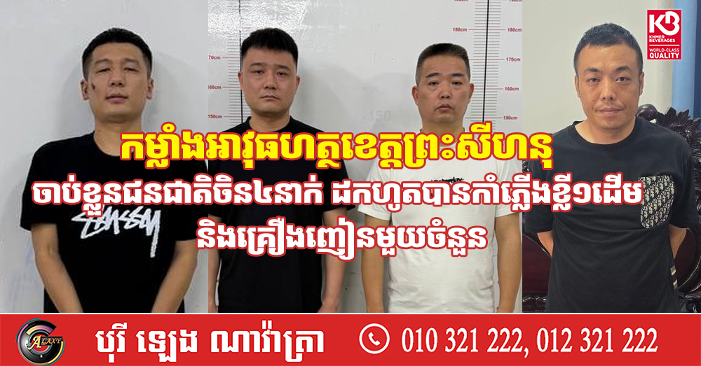 កម្លាំងអាវុធហត្ថខេត្តព្រះសីហនុ ចាប់ខ្លួនជនជាតិចិន៤នាក់ ដកហូតបានកាំភ្លើងខ្លី១ដើម និងគ្រឿងញៀនមួយចំនួន