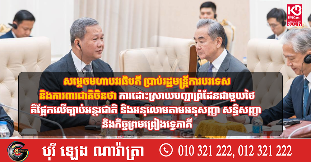សម្តេចមហាបវរធិបតី ប្រាប់រដ្ឋមន្ត្រីការបរទេស និងការពារជាតិចិនថា ការដោះស្រាយបញ្ហាព្រំដែនជាមួយថៃ គឺផ្អែកលើច្បាប់អន្តរជាតិ និងអនុលោមតាមអនុសញ្ញា សន្ធិសញ្ញា និងកិច្ចព្រមព្រៀងទ្វេភាគី