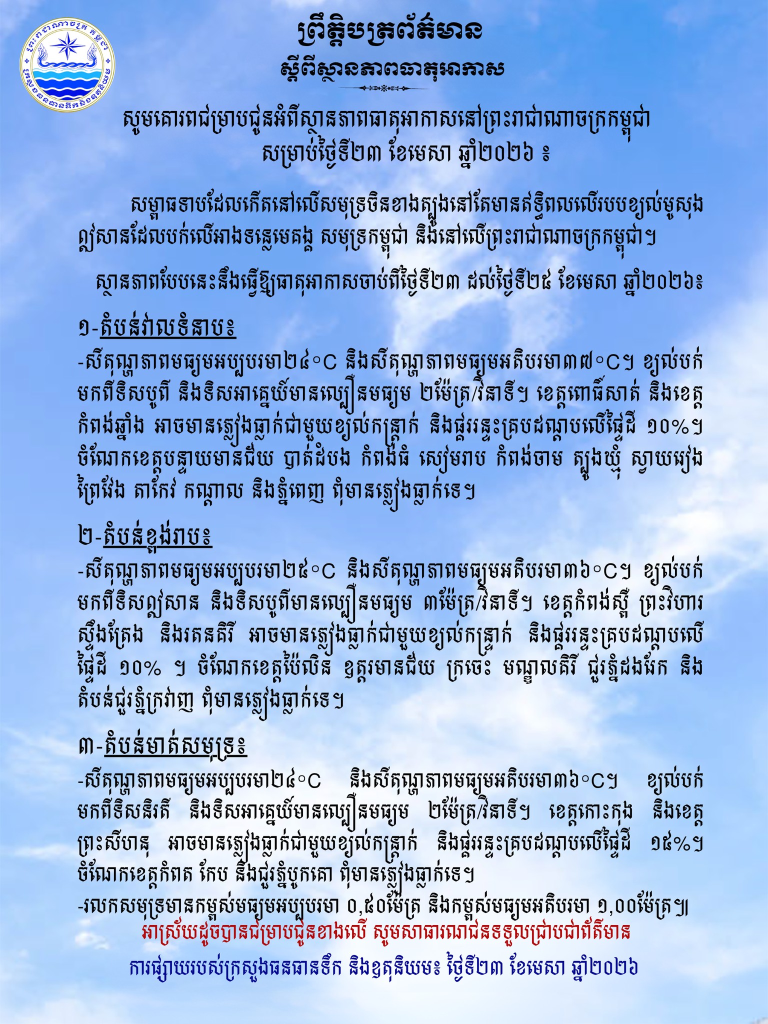 ក្រសួងធនធានទឹក ជូនដំណឹងអំពីស្ថានភាពធាតុអាកាសនៅកម្ពុជា សម្រាប់ថ្ងៃទី២៣ ខែមេសា ឆ្នាំ២០២៦