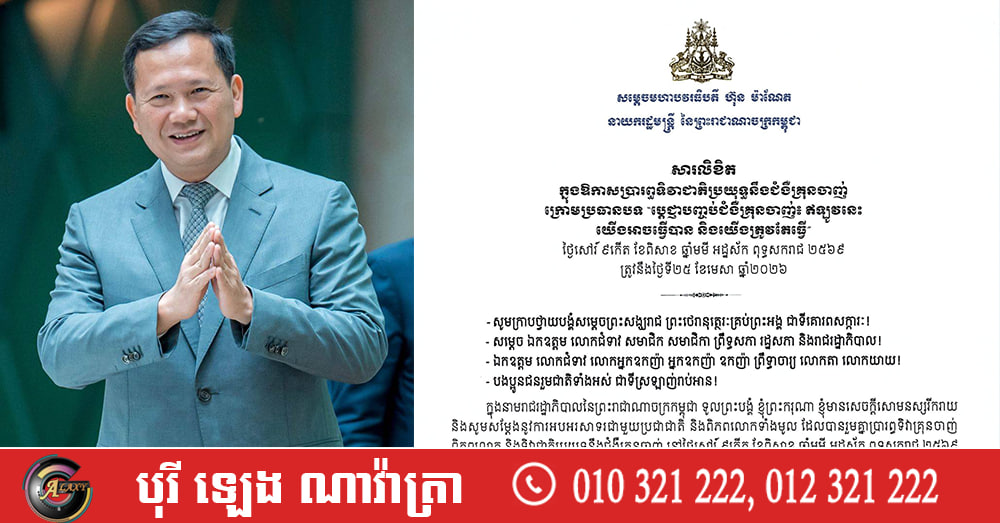 ខាងក្រោមនេះជាសារលិខិតរបស់សម្តេចបវរធិបតី ហ៊ុន ម៉ាណែត៖