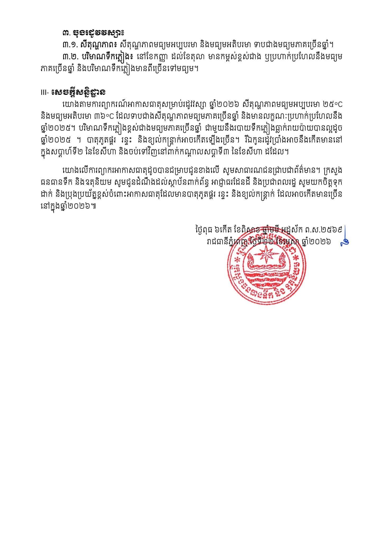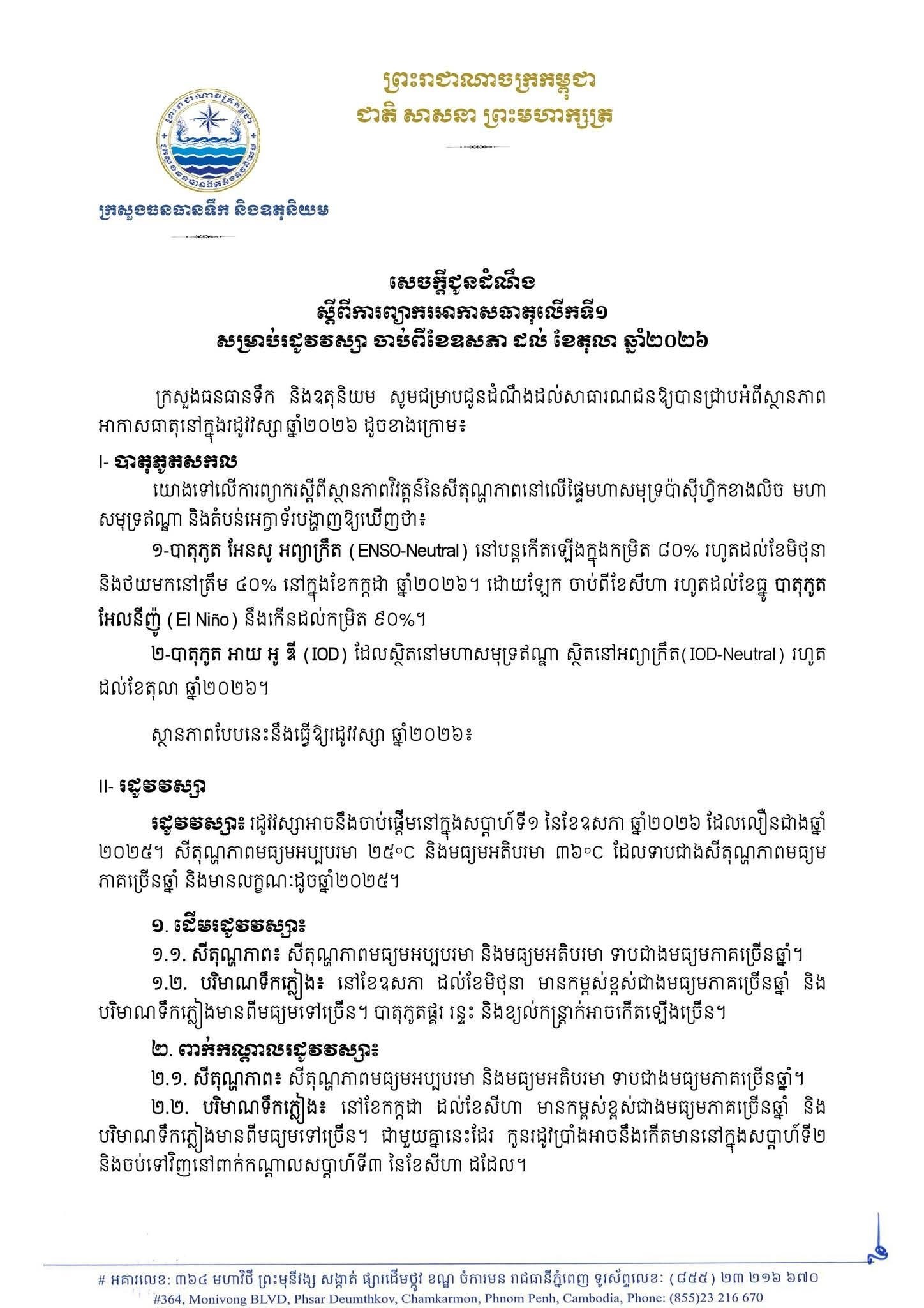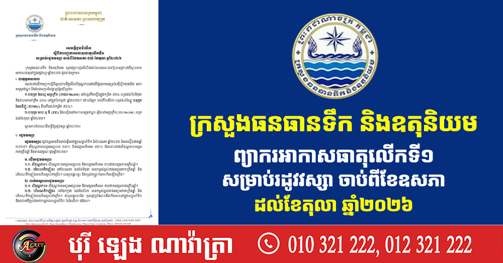 ក្រសួងធនធានទឹក និងឧតុនិយម ព្យាករអាកាសធាតុលើកទី១ សម្រាប់រដូវវស្សា ចាប់ពីខែឧសភា ដល់ខែតុលា ឆ្នាំ២០២៦