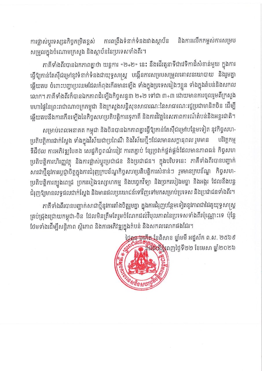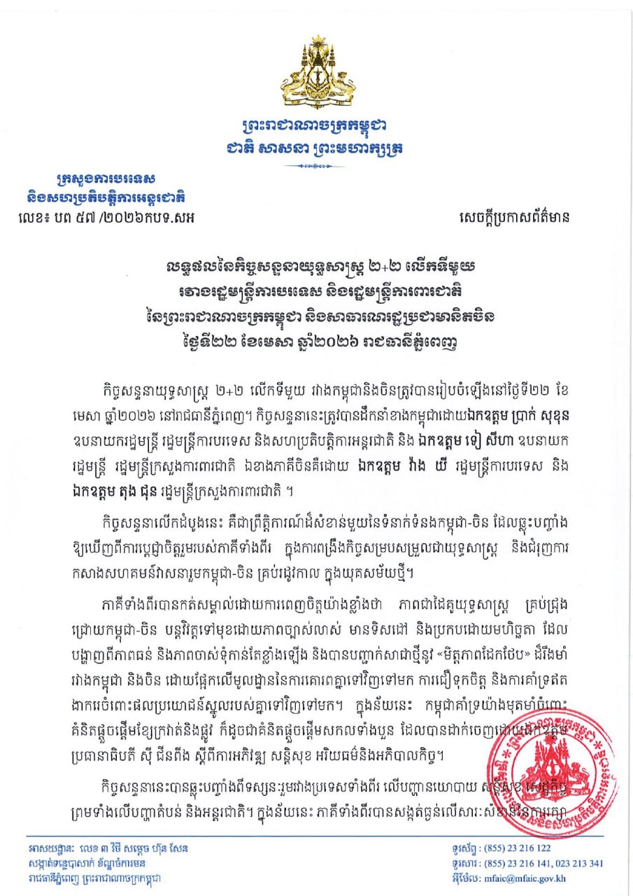 កិច្ចសន្ទនាយុទ្ធសាស្ត្រ ២+២ លើកទីមួយ រវាងកម្ពុជា និងចិន ត្រូវបានរៀបចំឡើងនៅថ្ងៃទី២២ ខែមេសា ឆ្នាំ២០២៦ នៅរាជធានីភ្នំពេញ។ កិច្ចសន្ទនានេះ ត្រូវបានដឹកនាំខាងកម្ពុជា ដោយលោក ប្រាក់ សុខុន ឧបនាយករដ្ឋមន្ត្រី រដ្ឋមន្ត្រីការបរទេស និងសហប្រតិបត្តិការអន្តរជាតិ និងលោក ទៀ សីហា ឧបនាយករដ្ឋមន្ត្រី រដ្ឋមន្ត្រីក្រសួងការពារជាតិ ឯខាងភាគីចិន គឺដោយលោក វ៉ាង យី រដ្ឋមន្ត្រីការបរទេស និងលោក តុង ជុន រដ្ឋមន្ត្រីក្រសួងការពារជាតិ។
