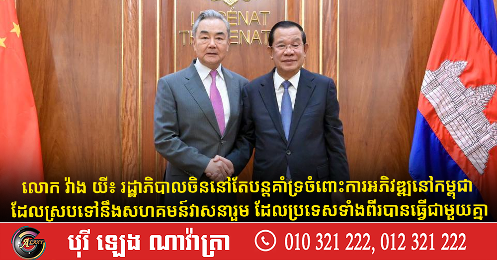 (ភ្នំពេញ)៖ រដ្ឋាភិបាលចិន នៅតែបន្តគាំទ្រចំពោះការអភិវឌ្ឍនៅក្នុងប្រទេសកម្ពុជា ដែលស្របទៅនឹងសហគមន៍វាសនារួម ដែលប្រទេសទាំងពីរបានធ្វើជាមួយគ្នា។ នេះជាការបញ្ជាក់របស់ លោក វ៉ាង យី រដ្ឋមន្ត្រីការបរទេសចិន ក្នុងឱកាសសម្តេចតេជោ ហ៊ុន សែន ប្រមុខរដ្ឋស្តីទី អនុញ្ញាតឲ្យជួបសវនាការ នៅថ្ងៃទី២៣ ខែមេសា ឆ្នាំ២០២៦ នៅវិមានព្រឹទ្ធសភា។