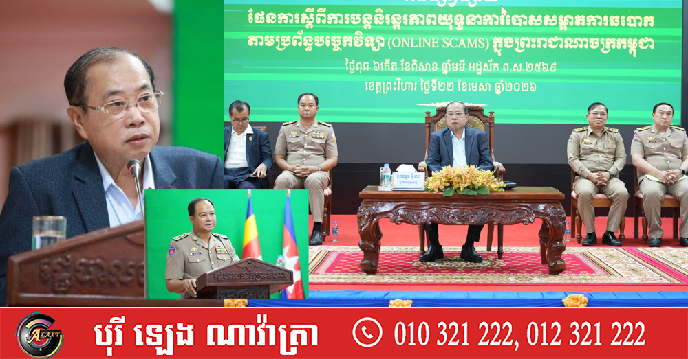 (ព្រះវិហារ)៖ រដ្ឋបាលខេត្តព្រះវិហារ នារសៀលថ្ងៃទី២២ ខែមេសា ឆ្នាំ២០២៦ បានរៀបចំពិធីផ្សព្វផ្សាយ ផែនការស្តីពីការបន្តនិរន្តរភាពយុទ្ធនាការបោសសម្អាតការឆបោកតាមប្រព័ន្ធបច្ចេកវិទ្យា (Online Scams) នៅក្នុងព្រះរាជាណាចក្រកម្ពុជា។