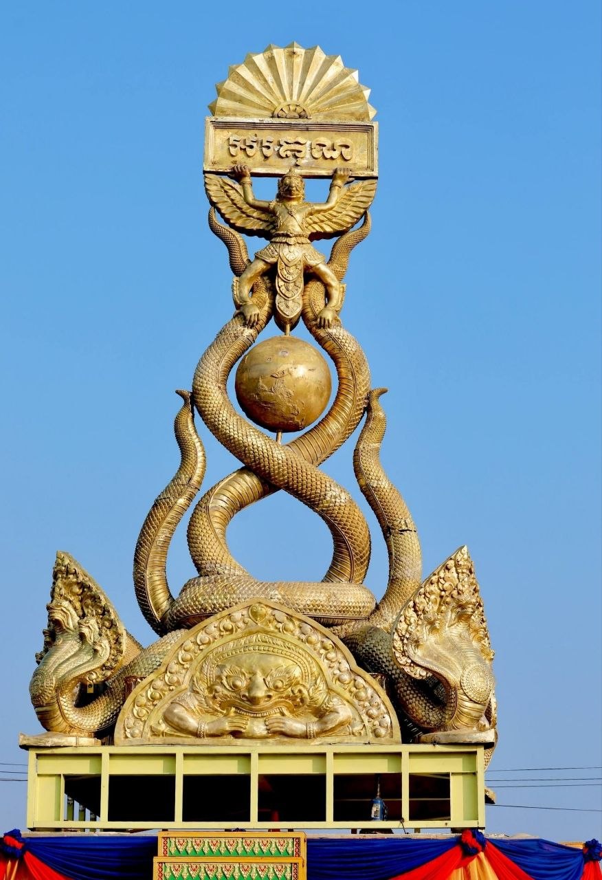 រូបសំណាកនាគព័ន្ធ នៅខេត្តកំពង់ចាម ធ្វើពីស្ពាន់សុទ្ធ ទម្ងន់ ៩តោន កម្ពស់ ១០ម៉ែត្រ បានរៀបចំក្រុងពាលីដំឡើង