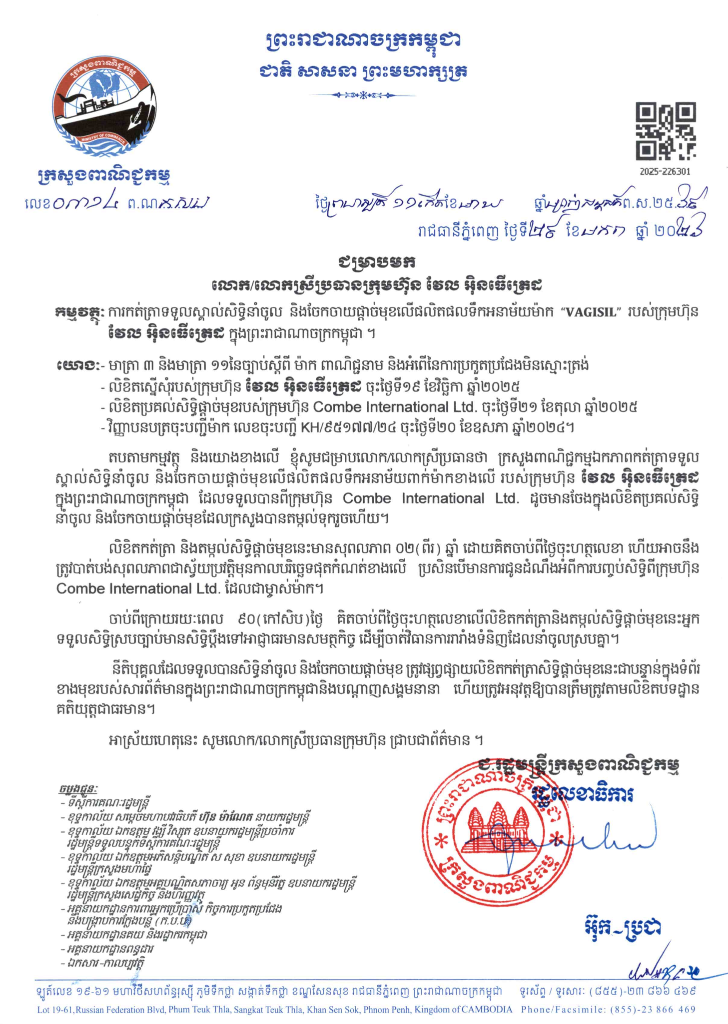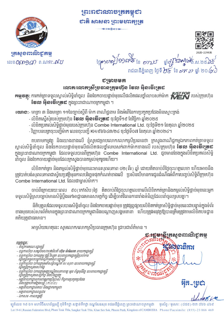 (ភ្នំពេញ)៖ ក្រសួងពាណិជ្ជកម្ម បានឯកភាពកត់ត្រាទទួលស្គាល់សិទ្ធិនាំចូល និងចែកចាយផ្តាច់មុខ លើផលិតផលទឹកអនាម័យម៉ាក «VAGISIL» និងផលិតផលថ្នាំលាបសក់ម៉ាក់ «JUST FOR MAN របស់ក្រុមហ៊ុន វែល អិនធើត្រេដ ក្នុងព្រះរាជាណាចក្រកម្ពុជា។