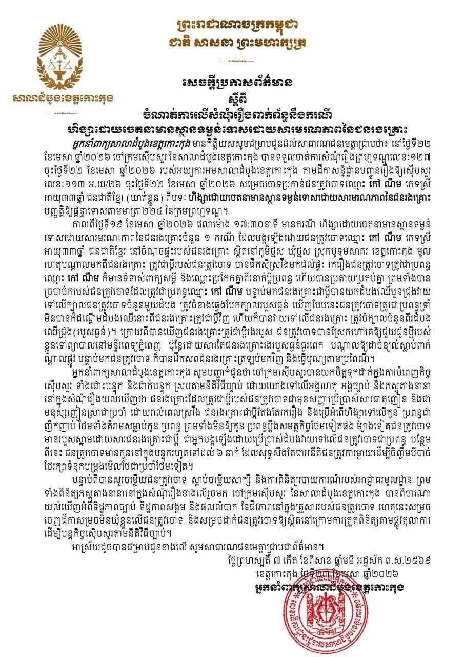 កាលពីថ្ងៃទី១៩ ខែមេសា ឆ្នាំ២០២៦ វេលាម៉ោង១៧៖៣០នាទី មានករណីហិង្សាដោយចេតនាមានស្ថានទម្ងន់ទោស ដោយសារមរណភាព នៃជនរងគ្រោះ ចំនួន១ករណី ដែលបង្កឡើងដោយជនត្រូវចោទ ឈ្មោះ កៅ ណឹម ភេទស្រី អាយុ៣៣ឆ្នាំ នៅចំណុចផ្ទះរបស់ជនរងគ្រោះ ស្ថិតនៅភូមិថ្មស ឃុំថ្មស ស្រុកបទុមសាគរ ខេត្តកោះកុង មូលហេតុបណ្ដាលមកពីជនរងគ្រោះ ត្រូវជាប្ដីរបស់ជនត្រូវចោទ បានផឹកស៊ីស្រវឹងមកដល់ផ្ទះរករឿងជនត្រូវចោទ ត្រូវជាប្រពន្ធឈ្មោះ កៅ ណឹម ក៏មានទំនាស់ពាក្យសម្ដី និងឈ្លោះប្រកែកគ្នាពីរនាក់ប្ដីប្រពន្ធ ហើយបានប្រតាយប្រតបគ្នា ព្រមទាំងបានច្របាច់ករបស់ជនត្រូវចោទ ដែលត្រូវជាប្រពន្ធឈ្មោះ កៅ ណឹម។