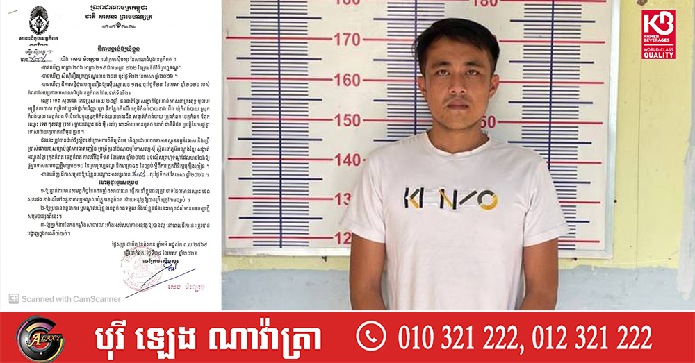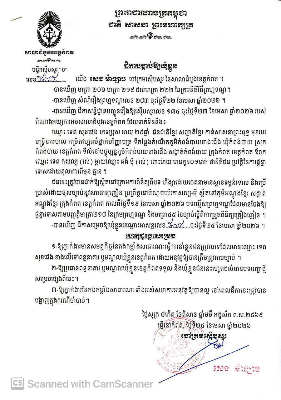 (កំពត)៖ លោក សេង ម៉ាឡាប ចៅក្រមស៉ើបសួរ នៃសាលាដំបូងខេត្តកំពត នៅថ្ងៃទី២៤ ខែមេសា ឆ្នាំ២០២៦នេះ បានចេញដីកាបង្គាប់ឲ្យឃុំខ្លួនមន្ដ្រីនគរបាលម្នាក់ ដាក់ពន្ធនាគារក្រោយបង្កដោយសារលើអ្នកដទៃ បណ្ដាលឲ្យរងរបួស ក្នុងហាងផឹកស៉ី ដោយគប់កែវលើអ្នកចាប់ទឹកកក ពីបទ «ហិង្សាដោយចេតនាមានស្ថានទម្ងន់ទោស និងប្រើប្រាស់គ្រឿងញៀន»។