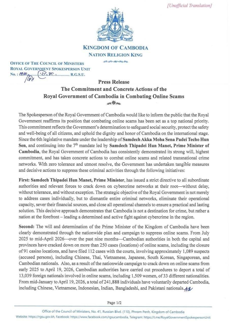(ភ្នំពេញ)៖ អ្នកនាំពាក្យរាជរដ្ឋាភិបាលកម្ពុជា នៅថ្ងៃទី២៤ ខែមេសា ឆ្នាំ២០២៦នេះបានចេញសេចក្តីព័ត៌មាន ស្តីពី ការប្តេជ្ញាចិត្តនិងសកម្មភាពជាក់ស្តែងរបស់រាជរដ្ឋាភិបាលកម្ពុជា ក្នុងការប្រយុទ្ធប្រឆាំងការឆបោកតាមប្រព័ន្ធបច្ចេកវិទ្យា (Online Scams)។