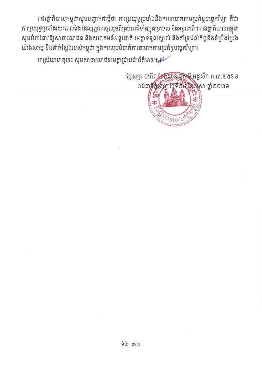 រាជរដ្ឋាភិបាល ចេញសេចក្តីប្រកាសព័ត៌មាន ស្តីពី ការប្តេជ្ញាចិត្តនិងសកម្មភាពជាក់ស្តែងរបស់រាជរដ្ឋាភិបាលកម្ពុជា ក្នុងការប្រយុទ្ធប្រឆាំងការឆបោកតាមប្រព័ន្ធបច្ចេកវិទ្យា (Online Scams)