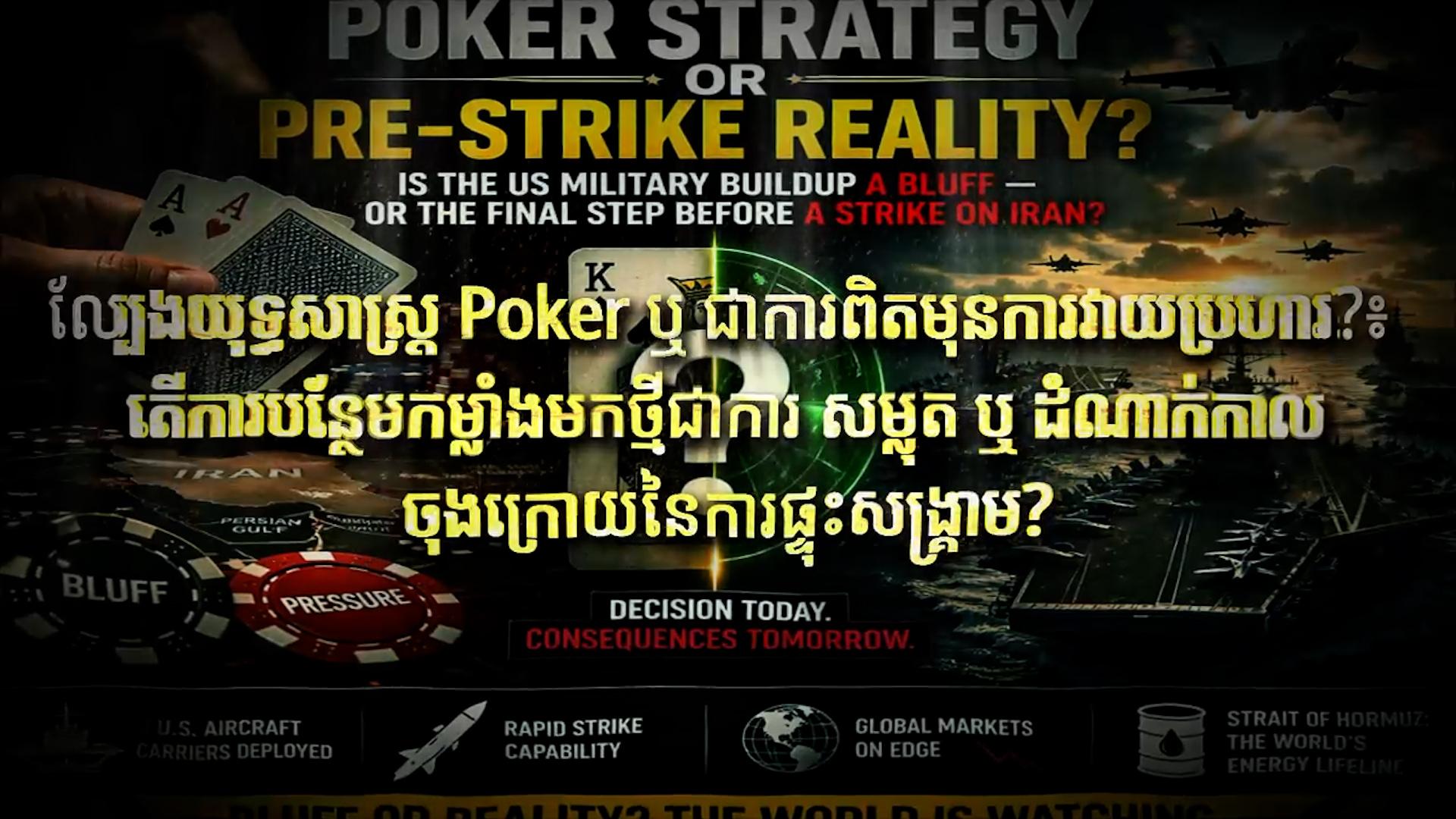 * សេចក្តីសន្និដ្ឋាន៖ ការបញ្ជូននាវាអាកាសយានដ្ឋាន៣គ្រឿង បង្ហាញថា សហរដ្ឋអាមេរិកកំពុងឈានចូលទៅកាន់ដំណាក់កាលមួយ ដែលមិនអាចត្រឹមតែគំរាមប៉ុណ្ណោះទេ ប៉ុន្តែជាសម្ពាធមួយដែលប៉ះ ពាល់ដល់វិបត្តិសេដ្ឋកិច្ចពិភពលោកផងដែរ។ លោក Donald Trump នៅជាមួយគ្នានេះ ថែមទាំងបាននិយាយសម្លុតទៀតថា ពេលវេលារបស់អ៊ីរ៉ង់ កាន់តែអស់បន្តិចម្តងៗហើយ «Iran’s clock is ticking»។ ប៉ុន្តែសម្តីគំរាមរបស់លោក ដូណាល់ ត្រាំ មិនមែនតែលើកនេះទេ, សម្តីគំរាមត្រូវបានគេឮ ដូចជាធម្មតាទៅហើយ។ ដូច្នេះសំណួរចុងក្រោយក្នុងពេលនេះ គឺថាតើការបន្ថែមកម្លាំងរបស់សហរដ្ឋអាមេរិកនេះ ជាល្បែងយុទ្ធសាស្ត្រ Poker ឬជាការពិតមែនទែននៅមុនការវាយប្រហារ?