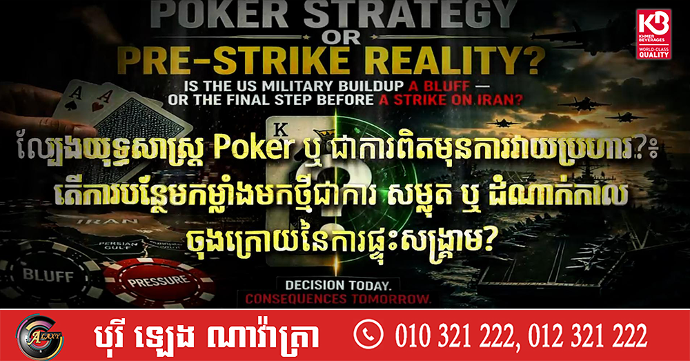 (ភ្នំពេញ)៖ នៅពេលដែលនាវាចម្បាំងផ្ទុកយន្តហោះអាមេរិកចំនួន៣គ្រឿង ត្រូវបានបញ្ជូនចូលទៅកាន់មជ្ឈិមបូព៌ា សំណួរដ៏ធំមួយកំពុងកើតឡើង៖ តើនេះជាការបង្ហាញកម្លាំងដើម្បីបង្ខំឱ្យចរចា ឬជាជំហានចុងក្រោយមុនសង្គ្រាមពិតប្រាកដ?
