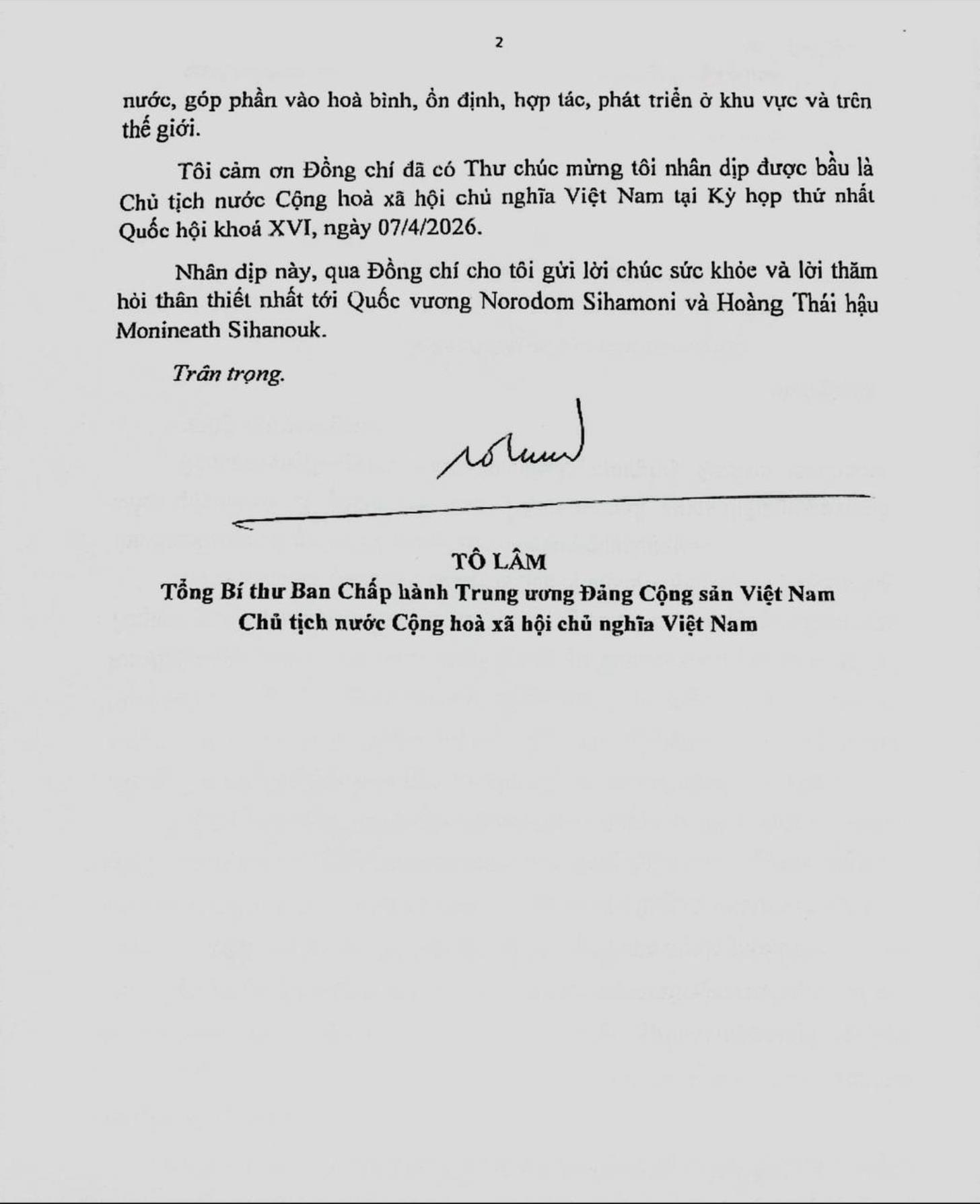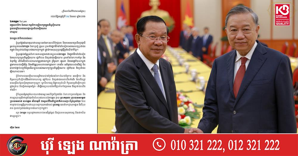 សម្ដេចតេជោ ហ៊ុន សែន ផ្ញើសារថ្លែងអំណរគុណលោក តូ ឡឹម ប្រធានរដ្ឋវៀតណាម ដែលផ្ញើលិខិតជូនពរ និងភួងផ្កាជូនសម្ដេច ក្នុងឱកាសបុណ្យចូលឆ្នាំថ្មី ប្រពៃណីជាតិខ្មែរកន្លងទៅ