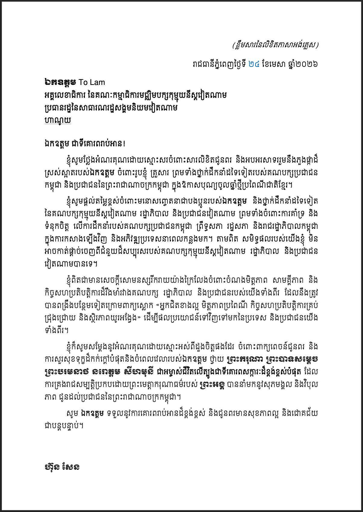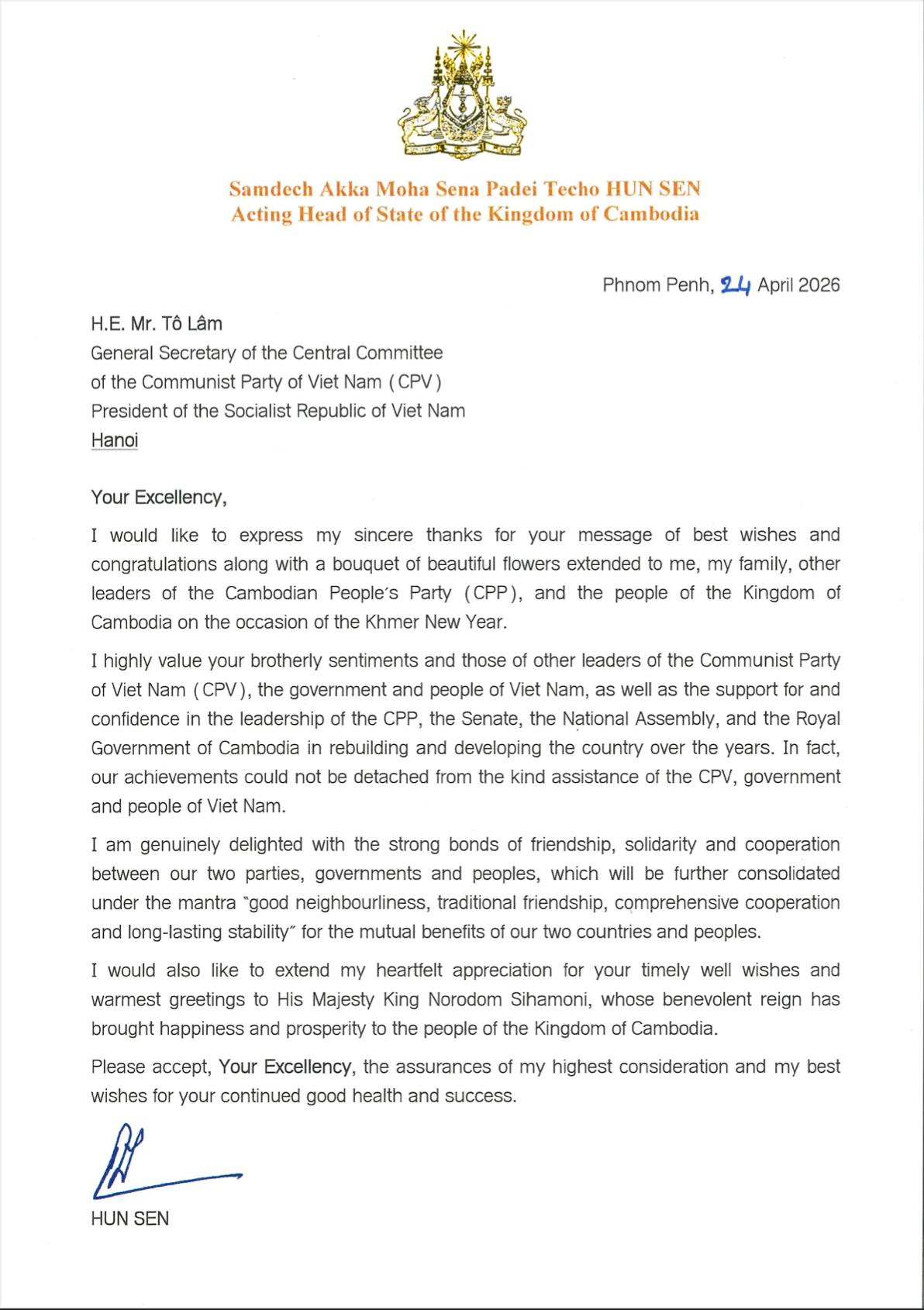ក្នុងលិខិតថ្លែងអំណរគុណដែលបណ្ដាញព័ត៌មាន Fresh News ទទួលបាននៅថ្ងៃទី២៤ ខែមេសា ឆ្នាំ២០២៦នេះ សម្ដេចតេជោ ហ៊ុន សែន បានបញ្ជាក់យ៉ាងដូច្នេះថា៖