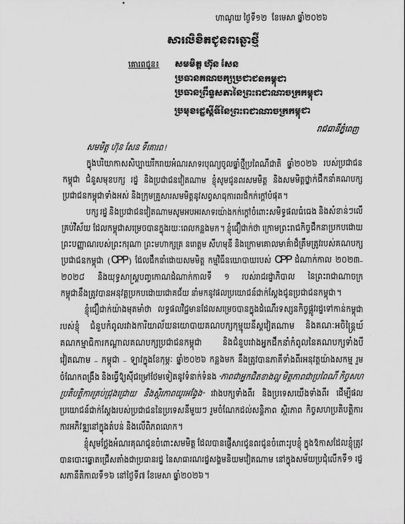 «ខ្ញុំសូមថ្លែងអំណរគុណដោយស្មោះសរ ចំពោះសារលិខិតជូនពរ និងអបអរសាទររួមនឹងភួងផ្កាដ៏ស្រស់ស្អាតរបស់ឯកឧត្តម ចំពោះរូបខ្ញុំ គ្រួសារ ព្រមទាំងថ្នាក់ដឹកនាំដទៃទៀតរបស់គណបក្សប្រជាជនកម្ពុជា និងប្រជាជននៃព្រះរាជាណាចក្រកម្ពុជា ក្នុងឱកាសបុណ្យចូលឆ្នាំថ្មី ប្រពៃណីជាតិខ្មែរ។