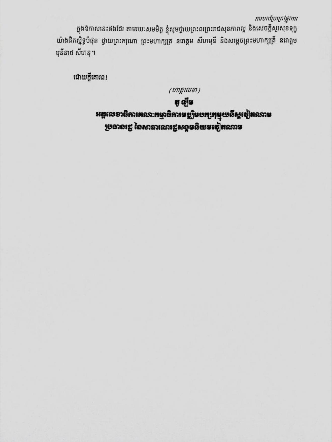 ខ្ញុំក៏សូមសម្តែងនូវអំណរគុណដោយស្មោះអស់ពីដួងចិត្តផងដែរ ចំពោះពាក្យពេចន៍ជូនពរ និងការសួរសុខទុក្ខដ៏កក់ក្តៅបំផុត និងចំពេលវេលារបស់ឯកឧត្ដម ថ្វាយព្រះករុណា ព្រះបាទសម្តេចព្រះបរមនាថ នរោត្តម សីហមុនី ជាអម្ចាស់ជីវិតលើត្បូងជាទីគោរពសក្ការៈដ៏ខ្ពង់ខ្ពស់បំផុត ដែលការគ្រងរាជសម្បត្តិប្រកបដោយព្រះមេត្តាករុណាធម៌របស់ ព្រះអង្គ បាននាំមកនូវសុភមង្គល និងវិបុលភាព ជូនដល់ប្រជាជននៃព្រះរាជាណាចក្រកម្ពុជា។